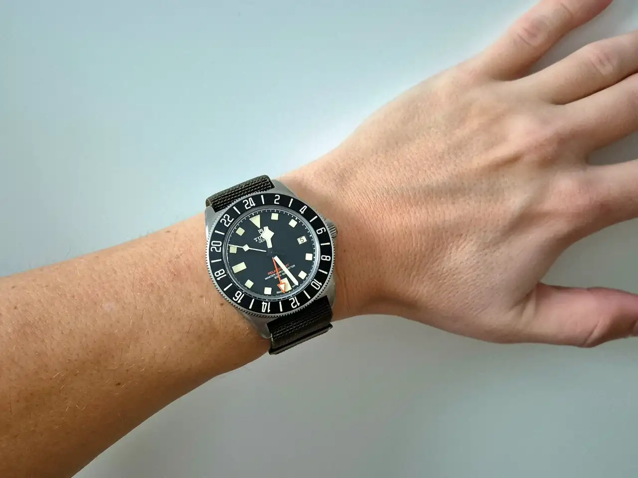 En esta búsqueda, y pensando en subir algo el nivel, me encontré un anuncio del nuevo Pelagos FXD GMT y me pareció brutal. Luego vi que es 42 mm y mi muñeca se queda en poco más de 16 cm, por lo que creo que va a ser demasiado grande. Tampoco me gusta mucho que no venga con armis aparte de la Nato. Aunque esta parece que le sienta muy bien habrá ocasiones en las que querría vestirlo algo más.