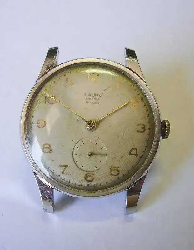 He llegado al mercadillo sobre las 8,30. Muy temprano, dirán algunos; pero no. Es muy tarde porque a esa hora ya han pasado y paseado por todos los puestos los sempiternos "veedores" (nuestros apreciados "buitres") sólo que a veces, tan sólo a veces, se les escapa algo. En la plaza de Los Carros había un señor bastante mayor, al que no recuerdo haber visto por allí nunca antes, con unos veinte relojes a cual más vintage. Quizás sería más correcto decir a cual más calamidad. Los miro y remiro, voy escogiendo los que me atraen y al final, juntados cuatro, le pido precio y ni con uno a uno ni con todos a la vez me cuadra lo ofertado. Así que me voy sin dejar de pensar en uno cuya caja me ha impresionado por su buena estampa; su máquina no estaba acorde ya que le pedí permiso para abrirlo. Vuelvo de nuevo al rato, le hago una oferta a la baja, naturalmente, la acepta y me lo traigo.