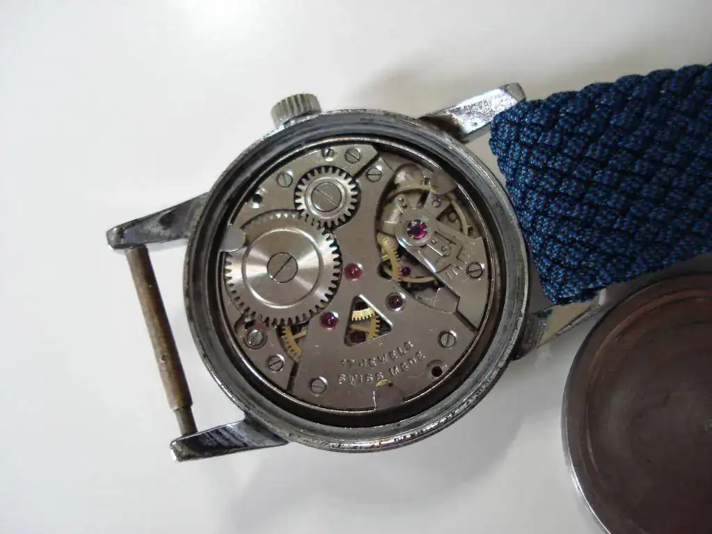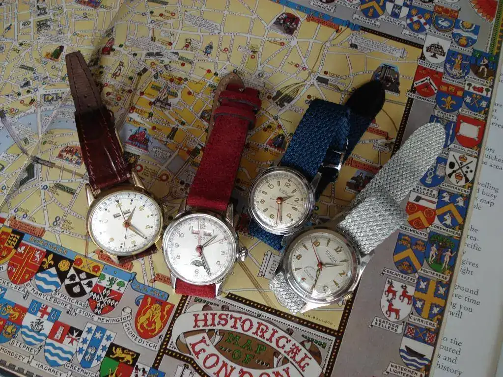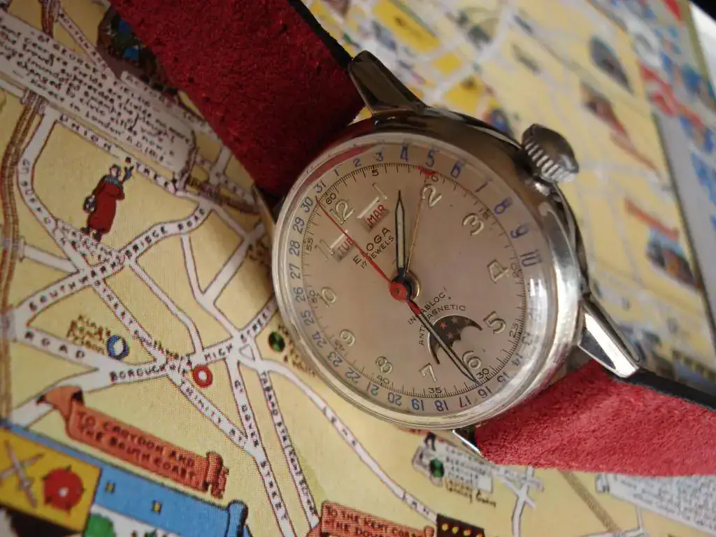 Hace casi un año, mi MDD, harto de oírme, se tropezó con una preciosa esfera y caja NOS de Rodania con esta configuración tricalendario y fase lunar y se lanzó a comprarlas sin dudarlo, pensando que ya resolvería lo del movimiento después. Resultó que en lugar de montar un calibre medio normal, necesitaba una Venus 206, que, además de producirse durante poco tiempo, fue utilizada fundamentalmente por Breitling. Por lo tanto, búsqueda complicada: a lo escaso había que añadir lo costoso
