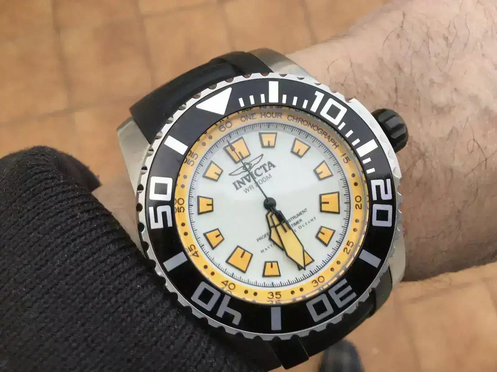 Te muestro el mío al que también le doy un uso similar, aunque este tiene la gracia de que lleva un crono muy particular del que sería largo explicar su funcionamiento y su esfera es radiactiva, se ilumina toda por la noche con un color azulado que combinado con el lumen amarillo de las agujas y los índices queda bonito, aunque su lumen no es ninguna maravilla espectacular, precisamente. Este angelito tiene 52mm de diámetro sin contar la corona y 17mm de altura. El segundero, cuando funciona como tal, (no como cronógrafo) va a saltitos dando la apariencia de un reloj mecánico.