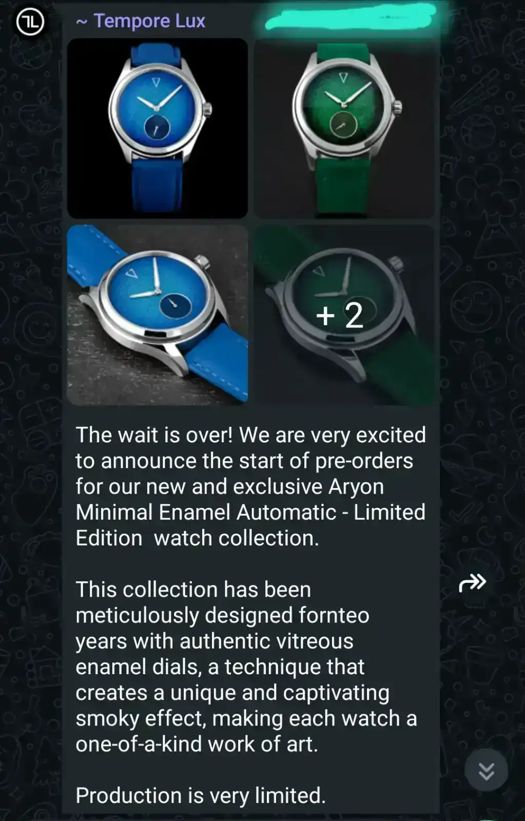 El creador de la misma es el responsable de Tempore Lux, por lo que cuando reiteradamente afirmó que la nueva marca llevaba diales enamel, me lo creí y confié en él. Lo posteé aqui solo por apoyar a una marca local