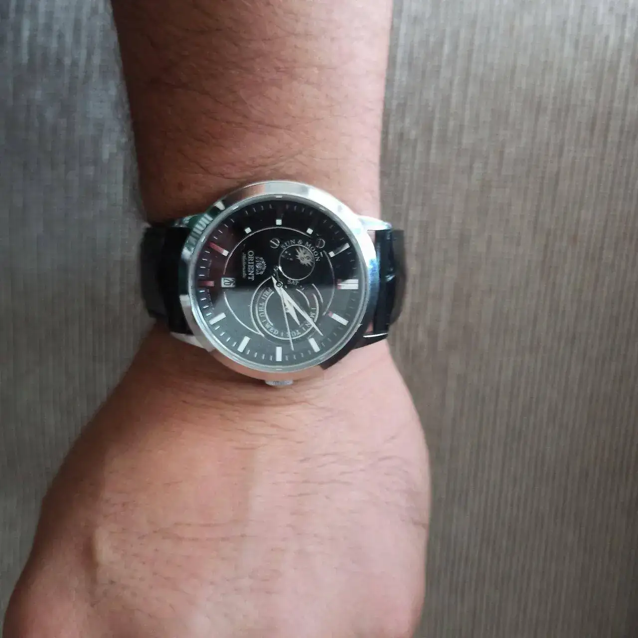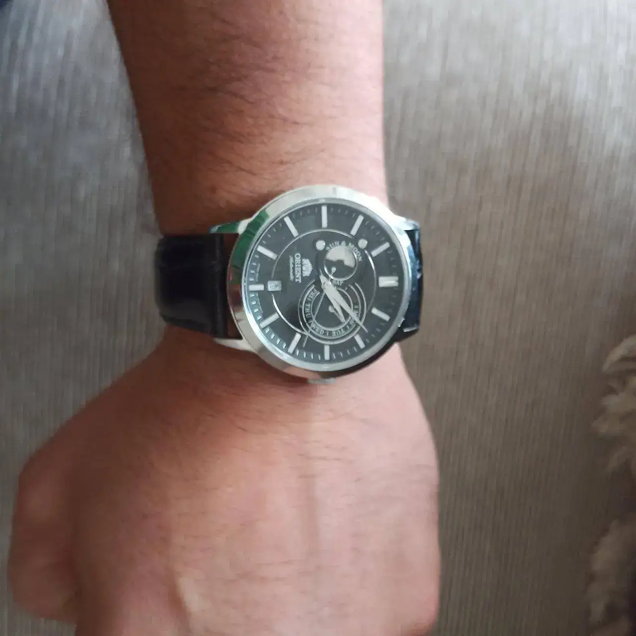 Este lo alternaba con un chrono Tissot super chulo de cuarzo que me robaron😭. Al terminar mis estudios me auto obsequié con el Orient que veís en las fotos, que me parecía una pasada el calendario del sol y de la luna, actualmente es el reloj que menos utilizo de los que tengo.