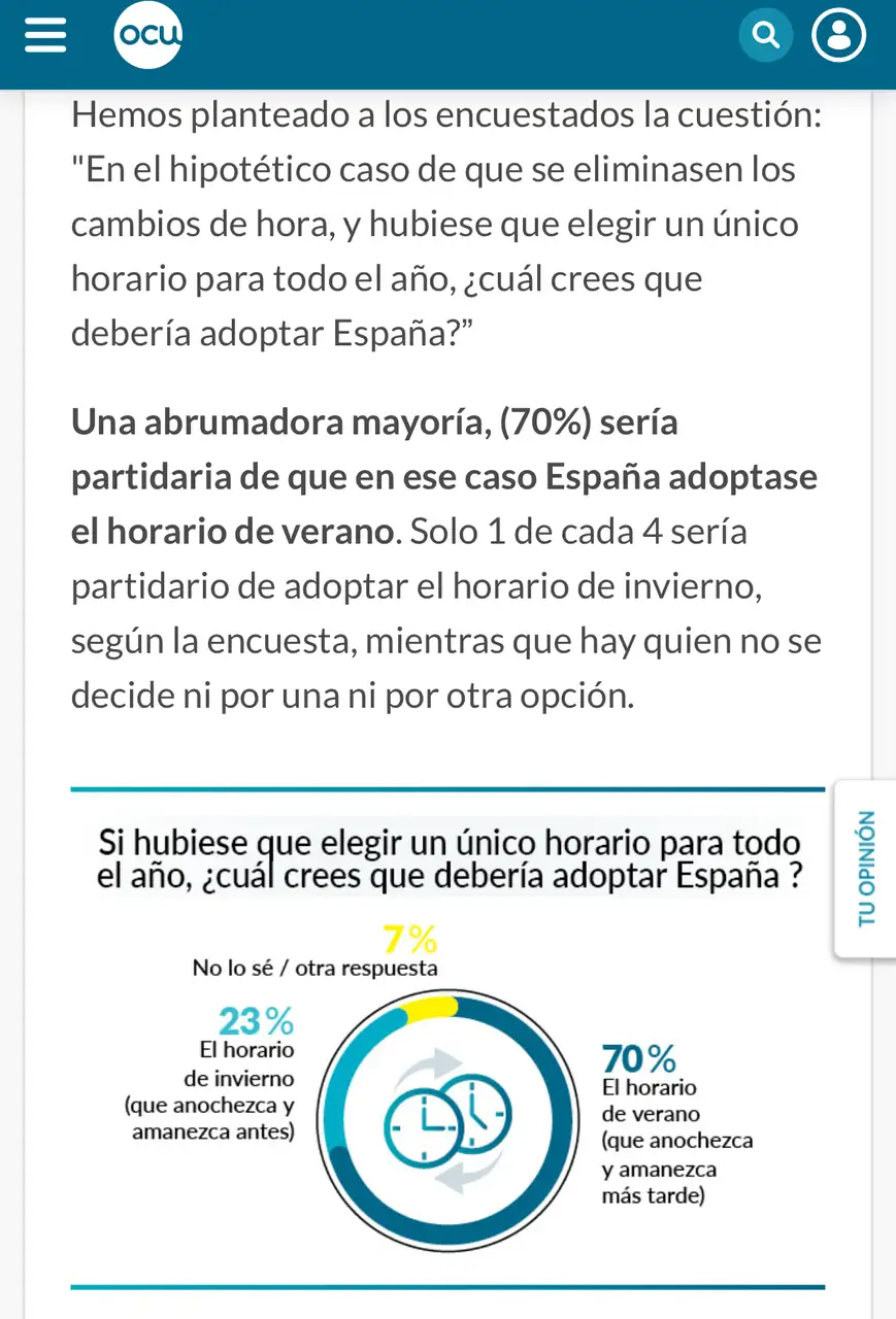 La encuesta tiene 3 opciones, pero la discusión (por ejemplo, lo ves en la encuesta de la OCU) es entre GMT+1 (el horario que tenemos en invierno) y GMT+2 (nuestro horario de verano).No, falso, está claro que la encuesta tiene tres opciones, no puedes agrupar dos porque a ti te interese.