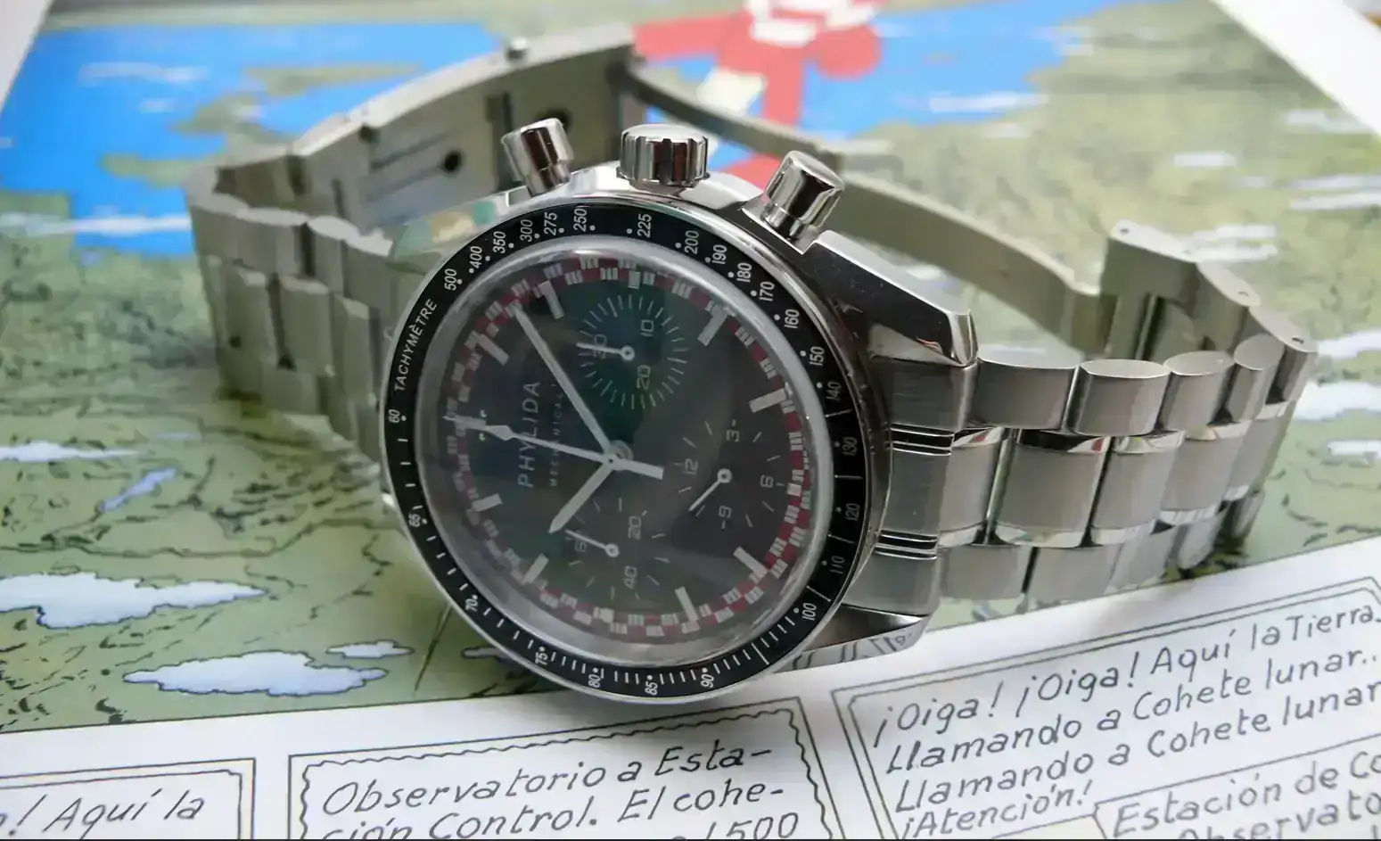 Según la historia del Speed Tintin original, Omega incluyó, según cuentan, el diseño del cohete en la esfera en la posición a las 11.