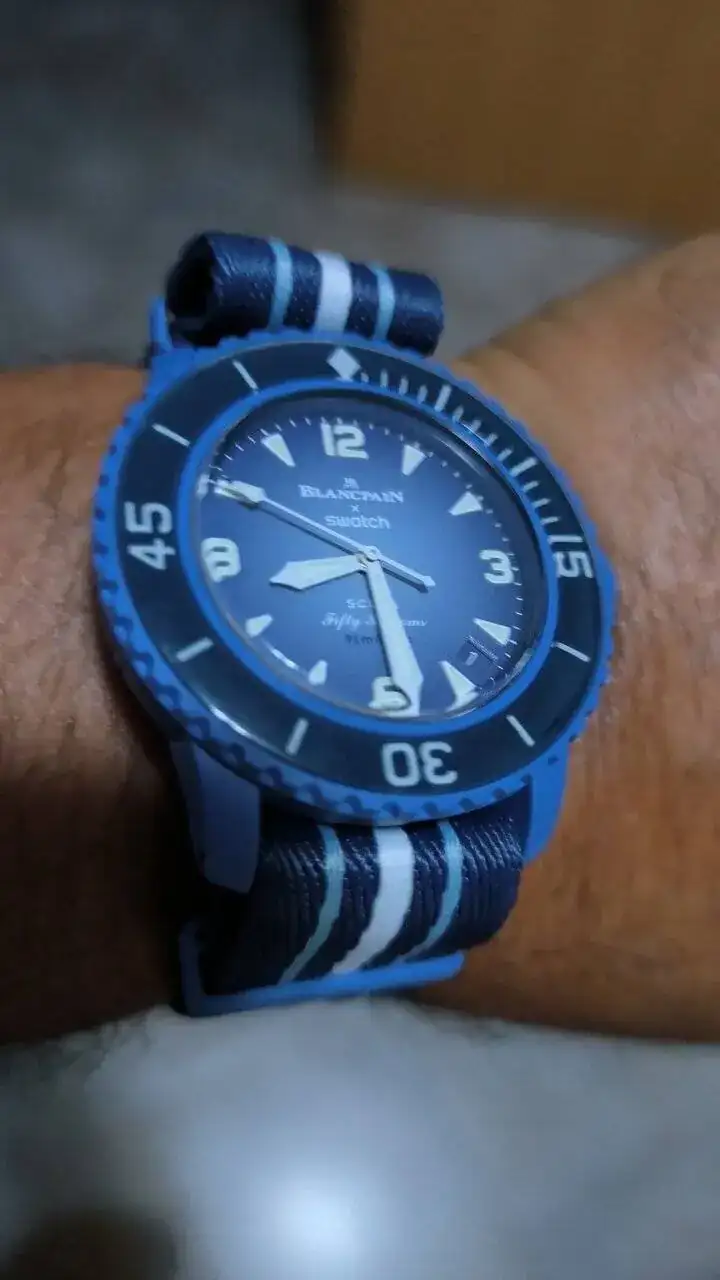 Me gusta cómo le queda la correa, pero no creo que le quede mejor que la suya original, simplemente le queda "distinta". Este mismo tema apareció en su día con el MoonSwatch (que si la correa original era lo peor del reloj, que si tal o pascual...) y nunca lo entendí porque la correa del MoonSwatch es parte fundamental del concepto del reloj. En el BP lo veo muy parecido aunque es cierto que la connotación de la correa del MoonSwatch me parece más acertada que la del BP, que representa simplemente (creo) el hecho de NATO + diver (combinación clásica para los diver) cuando en el MoonSwatch representa la correa de la NASA con la que se hicieron las misiones espaciales en las que el Moonwatch participó.Buenos días compañeros, tal y como veo que también ha hecho alguno de vosotros le he cambiado la correa poniéndole una a juego , como muchos sabéis los pasadores en este modelo son roscados con llave all… Por si alguno le interesa hacen falta dos llaves de 0,9 mm allen para poder sacar los pasadores.
