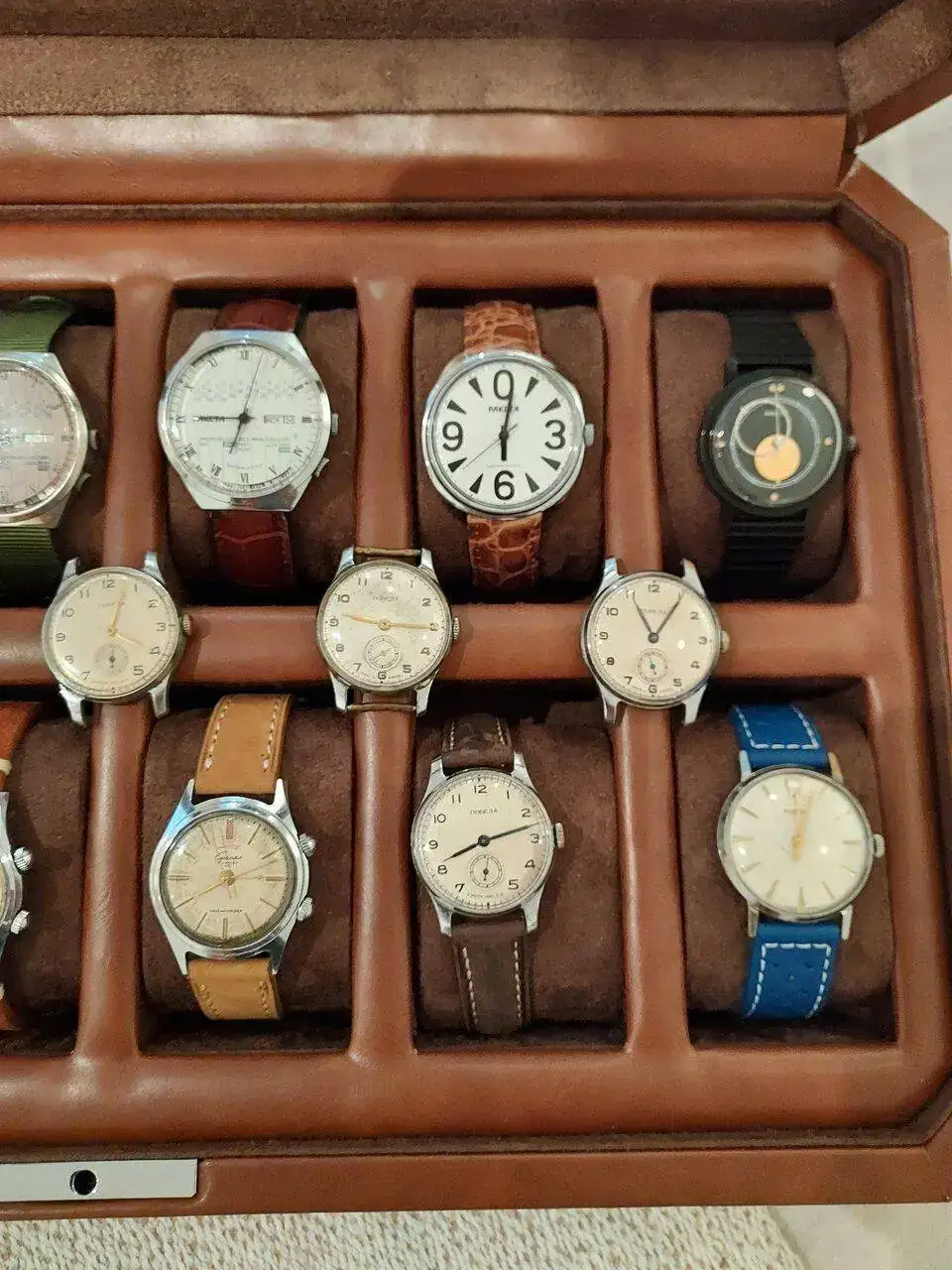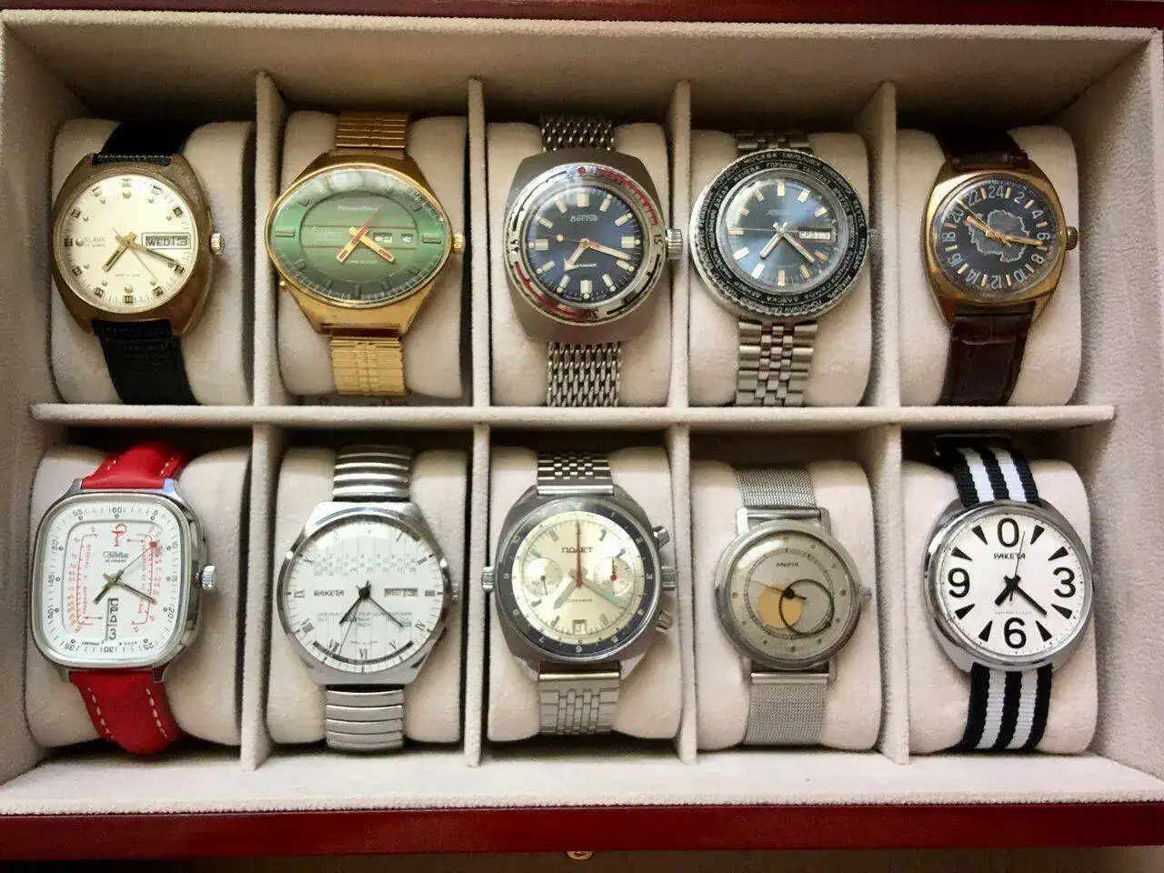 ) y que son un buen reflejo de los gutos y manias de cada cual... Como no he visto ningun hilo de este tipo aqui, y dado que he decidido terminar con una racha de compras de relojes rusos que me ha tenido entretenido estos ultimos meses, me lanzo a abrirlo yo, presentando mi caja. Si existe el hilo que comento y no lo he sabido encontrar, con gusto moveré el post.Sobre la coleccion, solo decir que empezó con una compra de flechazo, el Raketa perpetual calendar de dial blanco fue el que dió el pistoletazo de salida a esta obsesion. Raketas, pero también cronos Poljot fueron los primeros objetos de deseo... de ahi, el salto a los Pobedas, un vostok solitario, y al final los Signal que por ahora cierran esta racha...