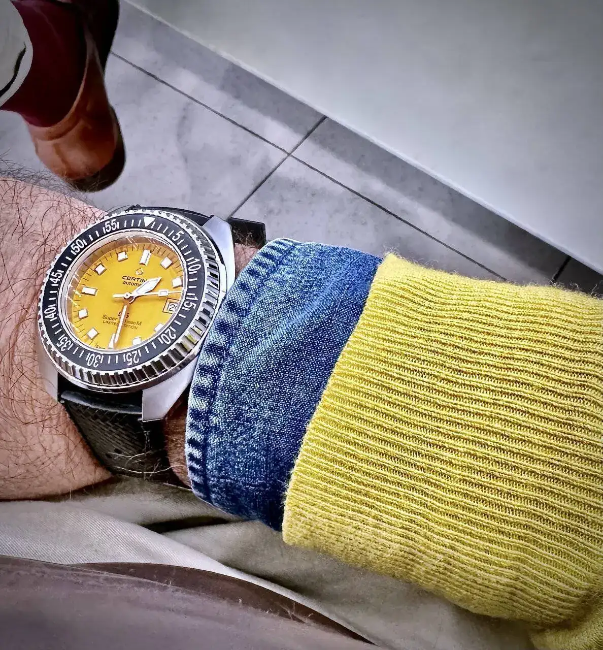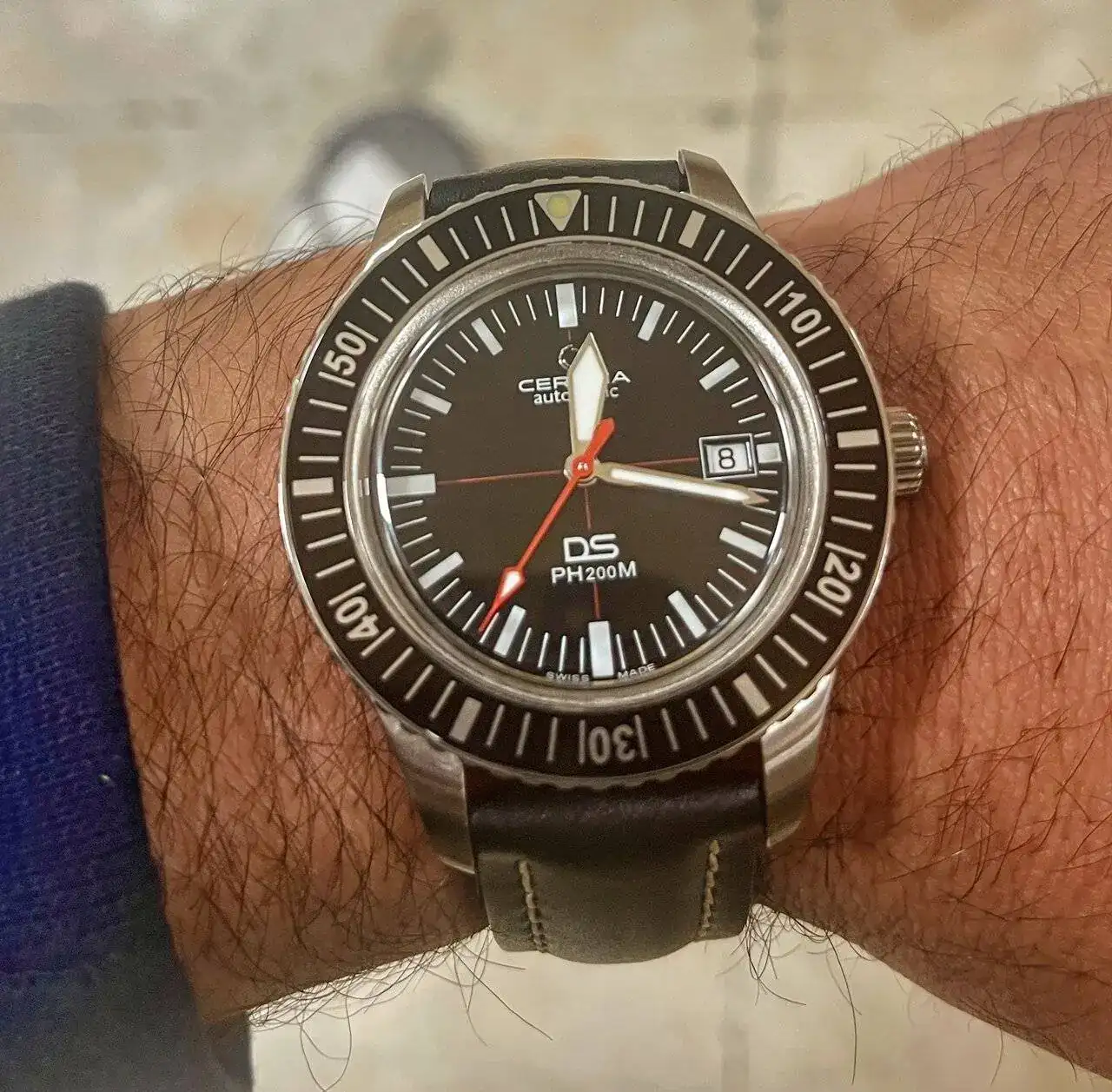 Muy bonito el reloj.Últimamente me estoy poniendo un Certina que tengo desde hace bastantes años y que tenía un poco olvidado, pero que como todo Certina tiene el atractivo de la marca y el plus de su sistema DS, es resistente, tiene buen hermetismo y lleva cristal de zafiro. Un típico Certina de los 90 de cuarzo, con el ubicuo eta 955.112 de siete rubís y el logotipo raro que usaron en aquella época, buscando algo nuevo para seguir adelante, aún terminando de salir de las décadas más duras para las marcas suizas, antes de estas dos últimas décadas en que Certina ha vuelto a mirar más a su gran historia y sus clásicos, con su logotipo de la buena época y reediciones preciosas. Pero con todo y con eso, me gustan los Certina de los 90 igual que muchos relojes de esa época. Con alrededor de 30 años, creo que es el reloj más antiguo que tengo con zafiro. El reloj tiene bastante tralla encima, el color rojo del logotipo un poco gastado y bastantes arañazos de todos sus años de uso, pero su cristal está impoluto, lleva su brazalete original, muy cómodo y bonito, sigue funcionando como el primer día y sigue siendo un bonito y digno representante de la Certina de los primeros años 90.