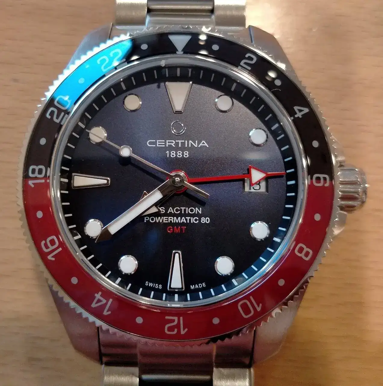 La aguja GMT también me parece bastante discreta aun siendo roja ... no se ve esa estridencia que aparentan otros relojes. Creo que en la versión verde habría sido un poco más difícil leer la segunda zona horaria para mí.