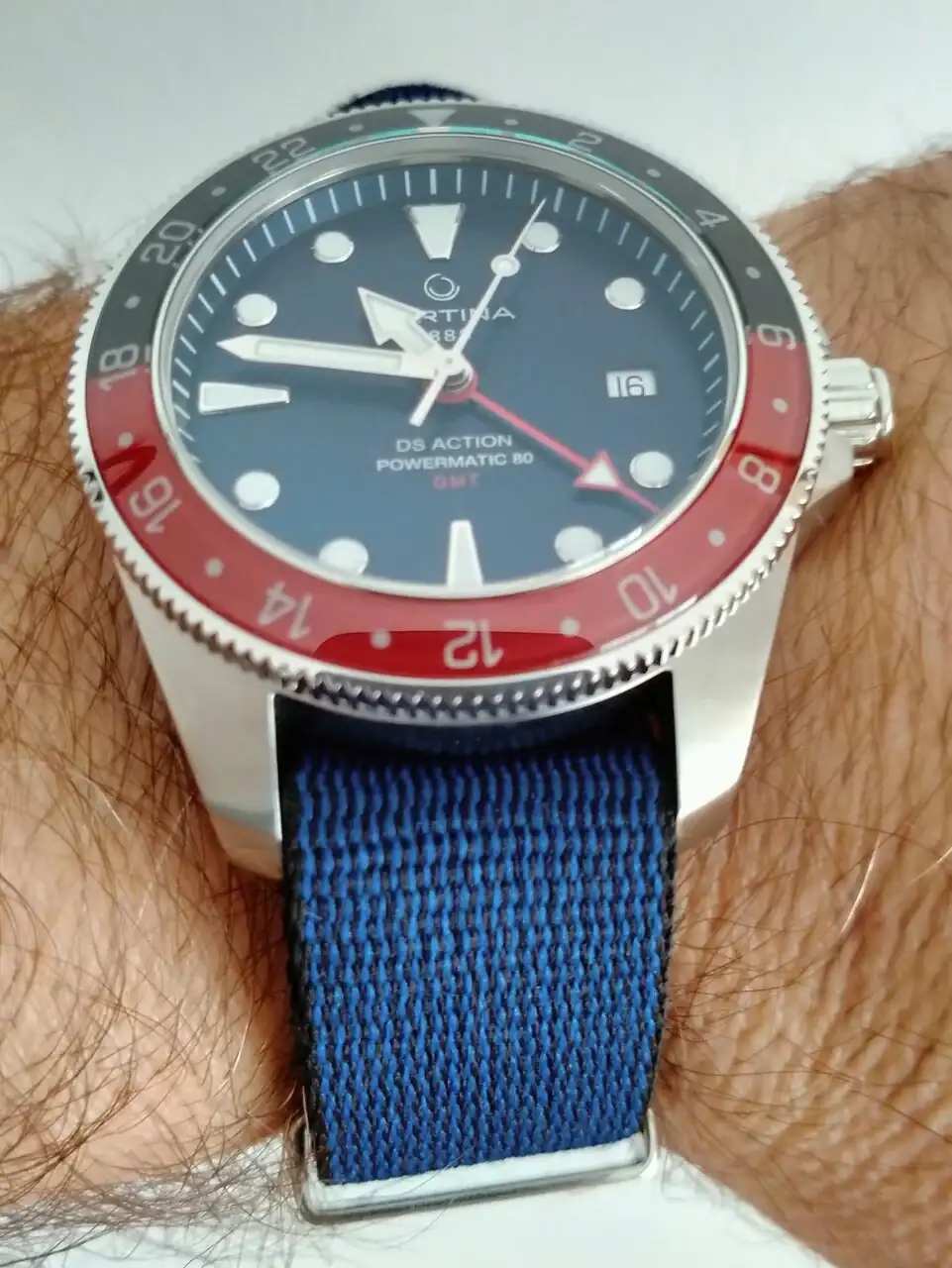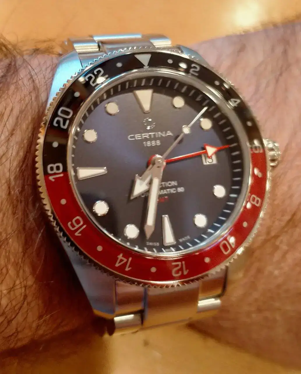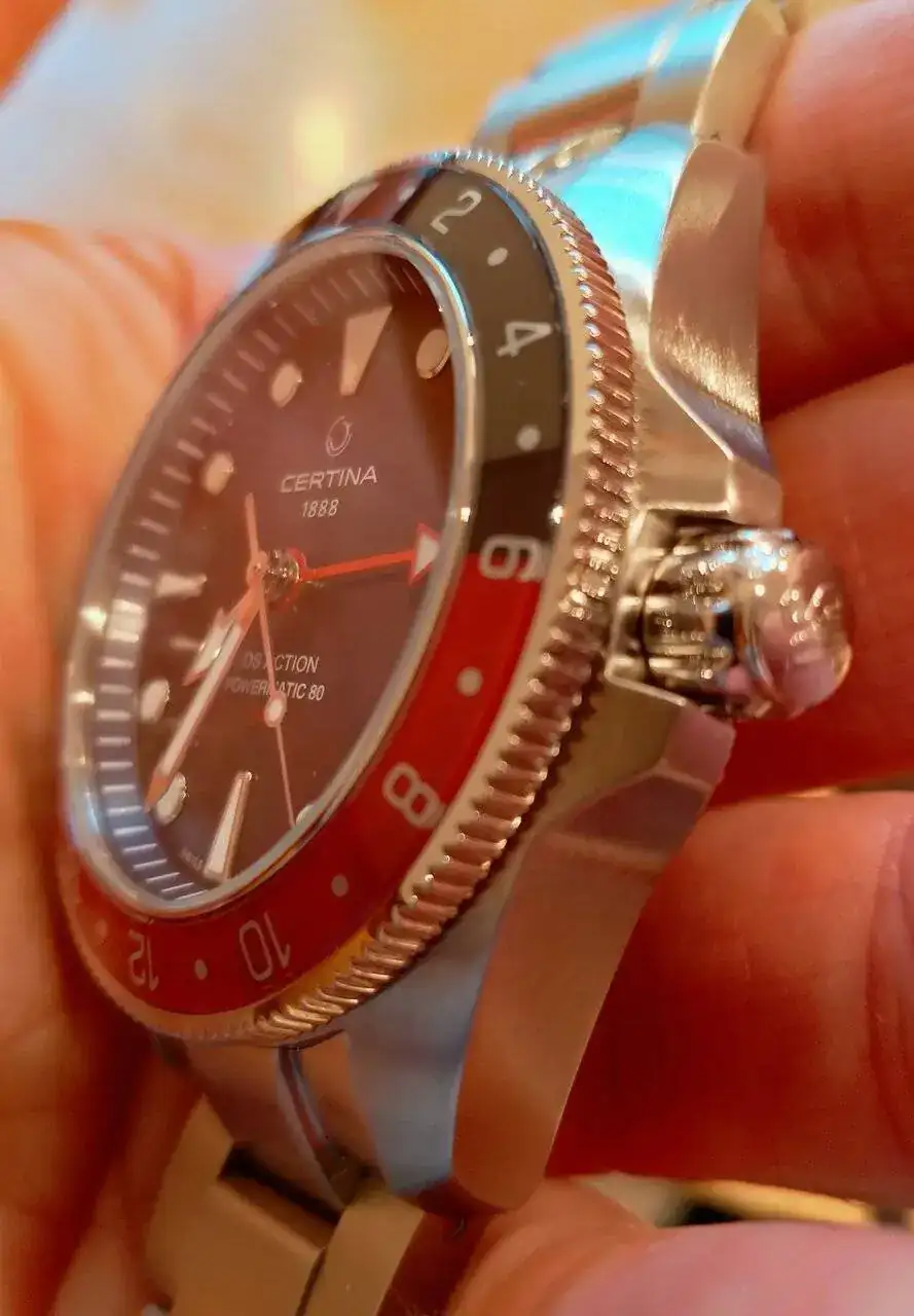 La aguja GMT también me parece bastante discreta aun siendo roja ... no se ve esa estridencia que aparentan otros relojes. Creo que en la versión verde habría sido un poco más difícil leer la segunda zona horaria para mí.
