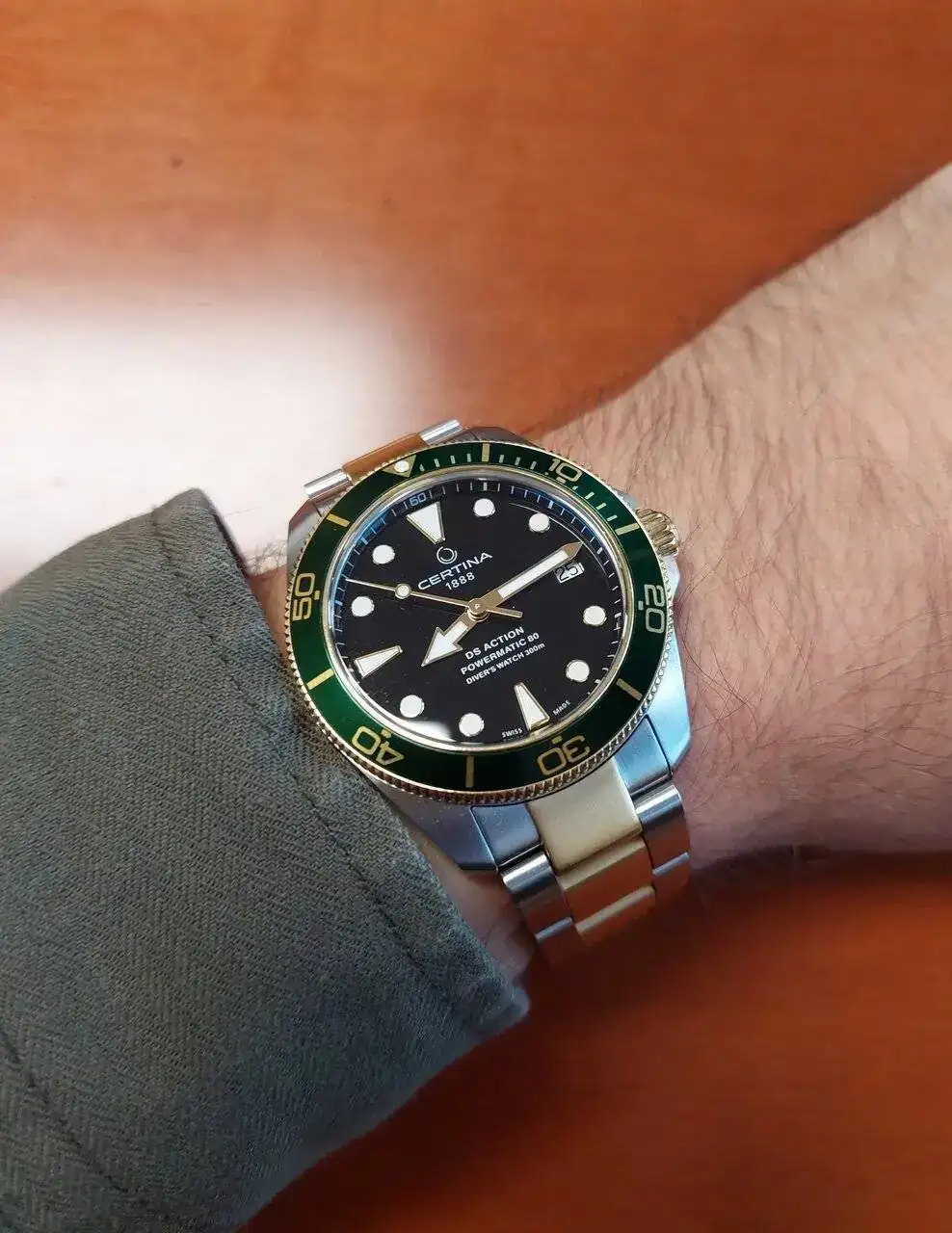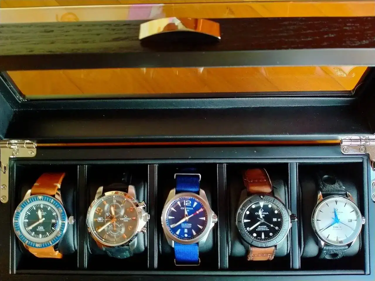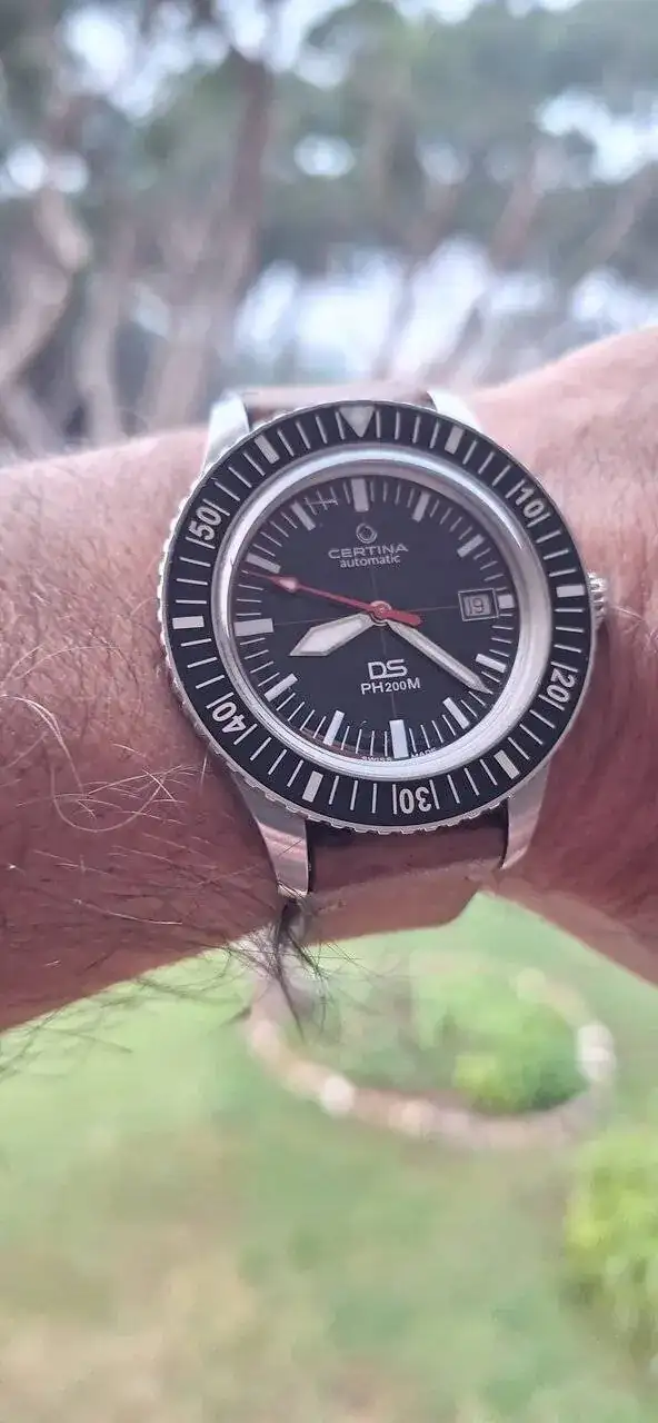 Es el más viejo (tiene cerca de 7 años). Va perfecto y es el que utilizo para poner a sus "desbocados" hermanos automáticos en hora. Ahí lo tengo con una Nato de la propia CERTINA que le queda mejor que cualquier otra, aunque también lo combino con otras correas (desde una Jacobo marrón que malogré hasta una de caucho de color naranja). Venía de origen con un armis que, con el tiempo y el uso sin contemplaciones (en el trabajo), me he cargado ...