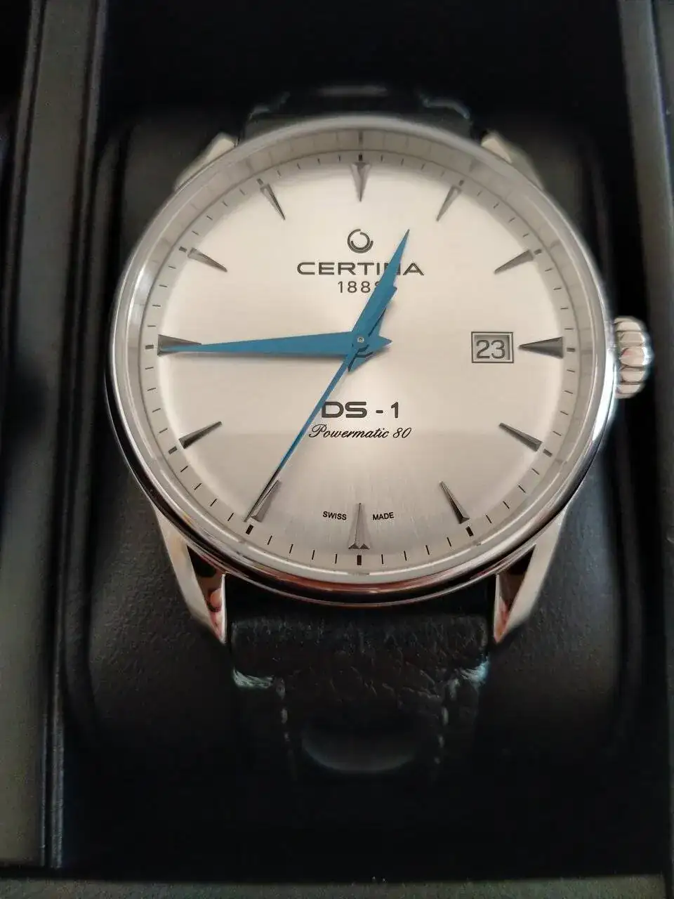 Ver el archivos adjunto 2797412DS1: Me parece el más versátil. En la foto lo tengo con una correa Hirsch Rally negra. También lo combino con las originales que traia de serie (una elegante correa de malla milanesa y una marrón estilo vintage). Además le suelo poner una Hirsch azul con acabado carbón y una textil, también azul de la casa Certina. La combinación de correas que se le pueden poner a este reloj es infinita y todas le quedan perfectas ...
