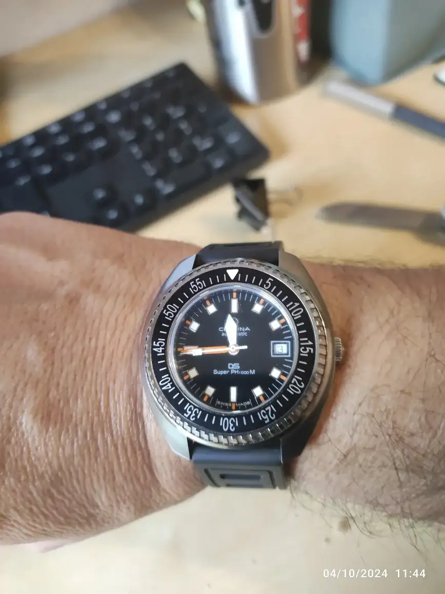 Del 1000M se puede decir lo mismo, pero además a mí esa caja es la que más me gusta, me parece un diver maravilloso. La caja tonel setentera le da una imagen contundente y musculosa al reloj que me encanta, y el bisel con su pinta tan maciza y ese estriado, en conjunto es una caja vintage contundente, pero sin dejar de tener la elegancia de los Certina. También los detalles naranja en los índices y minutera quedan muy bonitos, igual que en el Seiko Tortuga PADI. En este tuyo de esfera negra esos detalles resaltan más que en los Super PH1000M de otros colores.