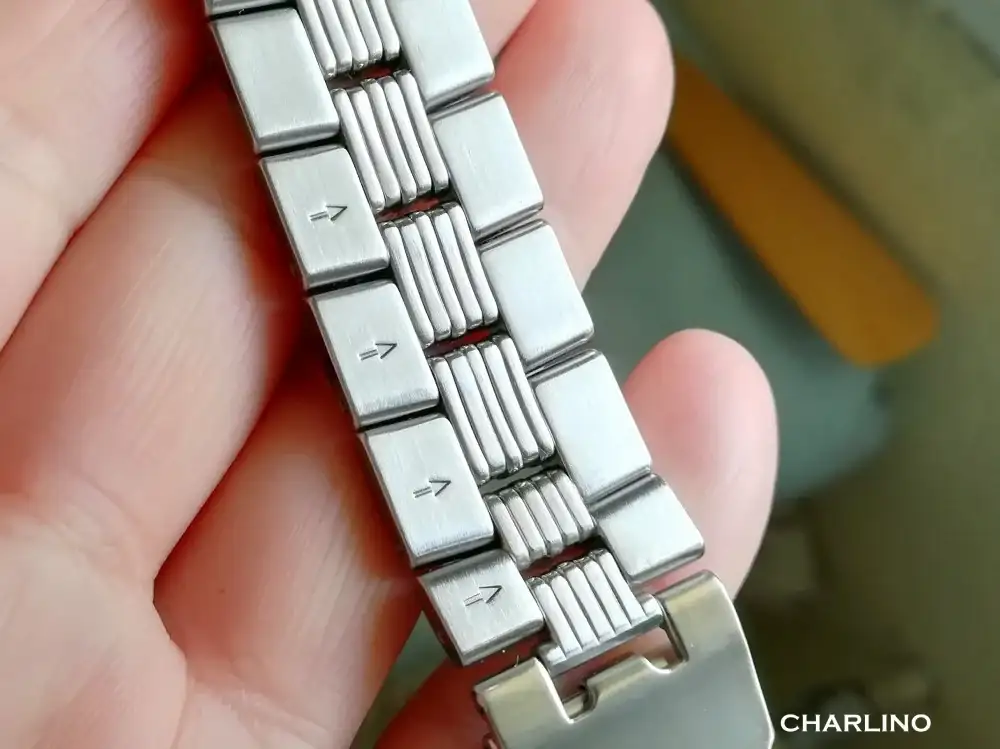 El brazalete encaja perfectamente entre las asas del reloj, y estéticamente queda en este reloj igual de bien que en su hermano automático de la época. Pero además se siente la calidad tanto al verlo de cerca como al ponerte el reloj. Todos los eslabones están rebajados en los bordes, y además montados a una distancia calculada perfecta para evitar ruidos y para que el armis sea tan cómodo al tacto como al oído. El cepillado es muy suave, y el eslabón central que lo hace tan elegante no es de una sola pieza, sino que son cinco piezas distintas, perfectamente mecanizadas, cepilladas y pulidas y ensambladas de manera que quedan como una sola pieza de un acabado soberbio. De cerca este brazalete no deja lugar a dudas de su calidad.