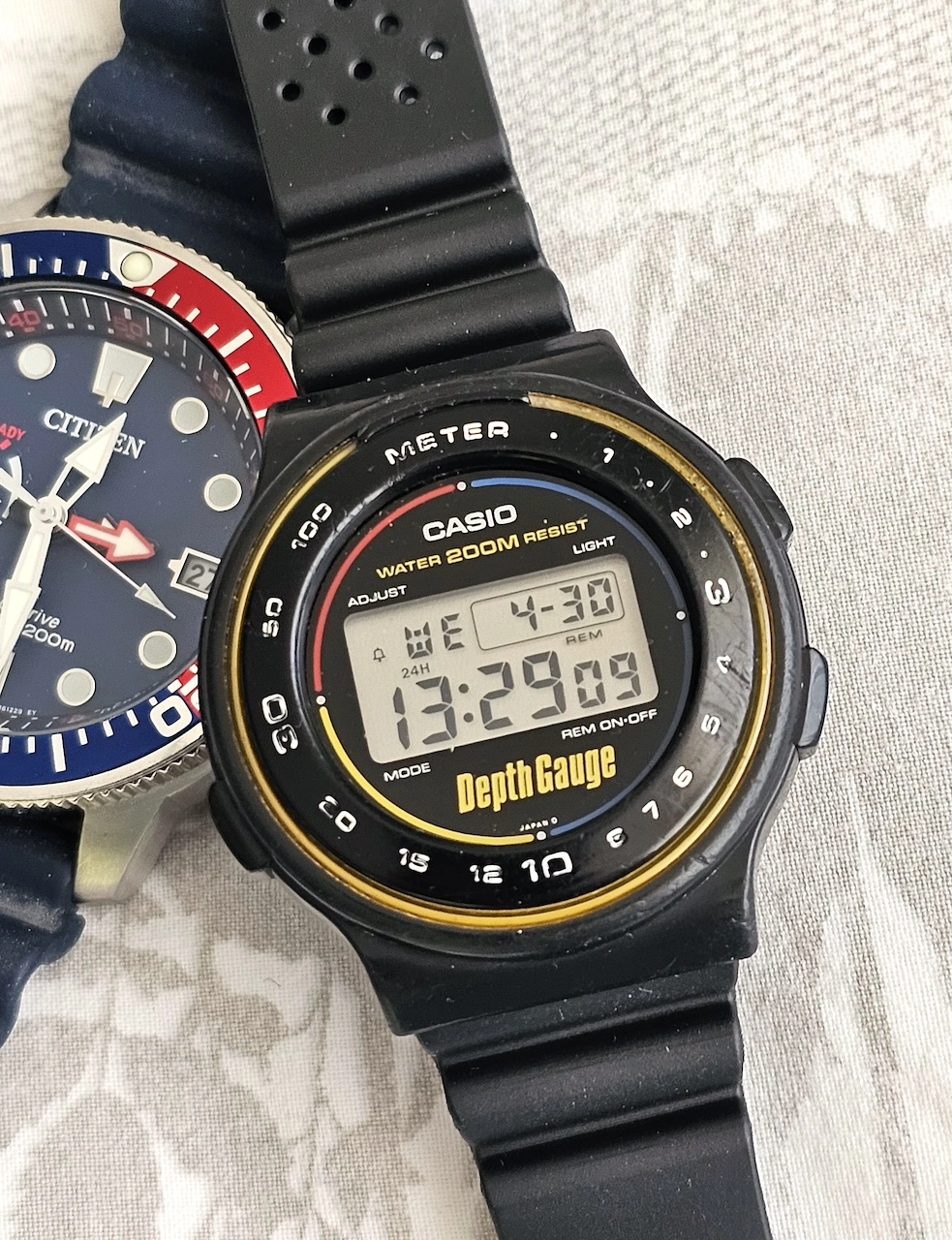 Ayer estuve viendo El Abismo de 1989 (Ed Harris, Mary Elizabeth Mastrantonio), y el "malo" Lt. Coffey (Michael Biehn) usa justamente uno de éstos. Probablemente con el bisel del profundímetro en pies, ya que fabricaron ambos.