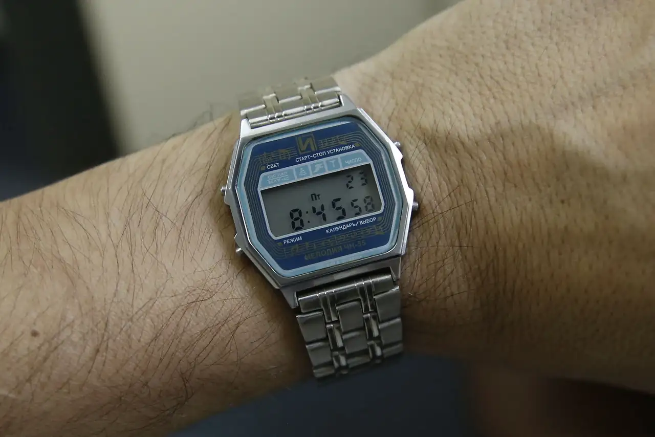 Elektronika-5 ruso aún de época soviética, años 80. Una curiosidad de reloj, que como otras cosas de la Rusia de aquella época, tiene cosas ingeniosas que sorprenden a la vez que otras muy toscas y primitivas. Por ejemplo, tiene la sofisticación de poder ajustar la precisión de la hora sin tener que abrir el reloj, con los botones. En un reloj de cuarzo, hoy día es un lujo poder ajustar la marcha, lo tienen pocos relojes. Casio lo ha ido quitando de sus módulos. Sin embargo, casi todos estos vintage que he enseñado tienen su tornillito de ajuste de la marcha en el módulo, al lado de la pila, lo cual está muy bien. Pero hay que abrir el reloj. El sistema del Elektronika es por lo tanto muy sofisticado, mientras que el brazalete original que lleva es de lo más tosco que he visto en mi vida. Tampoco me da la sensación de fiabilidad usándolo que me dan los Casio de los años 80; la pantalla por ejemplo es muy frágil, tiene mucha tendencia al sangrado, y si se saca el módulo para algo, hay que manejarlo con mucha delicadeza. Pero ahí sigue.