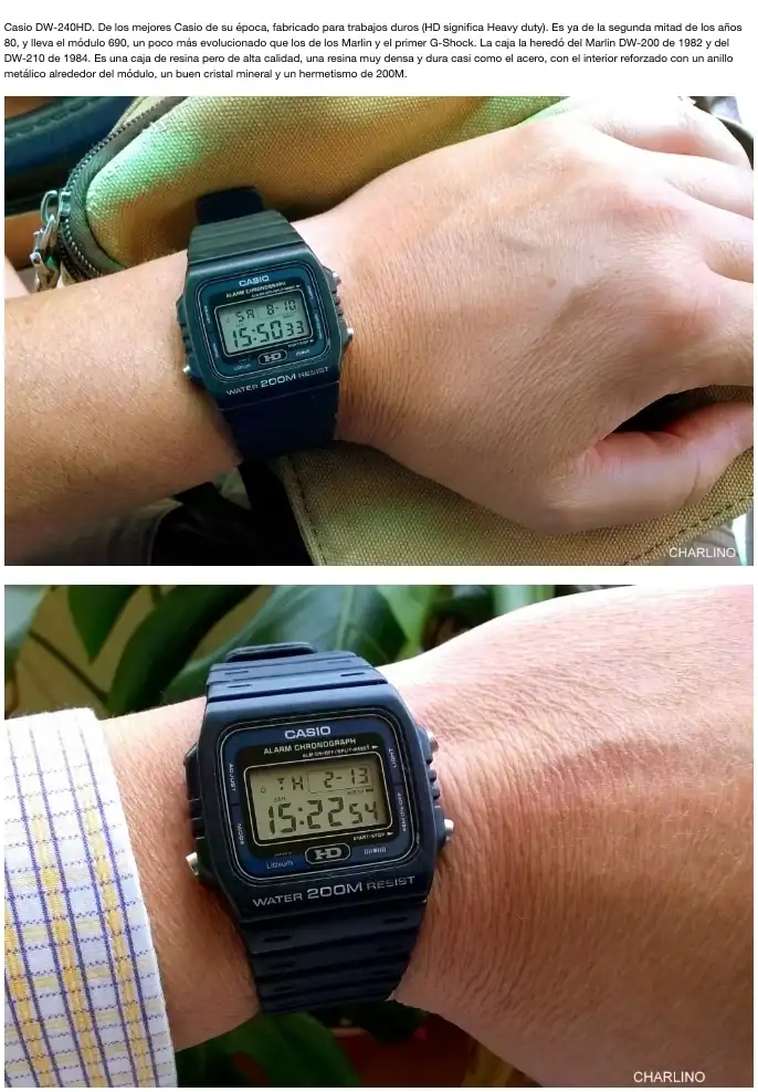 Casio DW-240HD. De los mejores Casio de su época, fabricado para trabajos duros (HD significa Heavy duty). Es ya de la segunda mitad de los años 80, y lleva el módulo 690, un poco más evolucionado que los de los Marlin y el primer G-Shock. La caja la heredó del Marlin DW-200 de 1982 y del DW-210 de 1984. Es una caja de resina pero de alta calidad, una resina muy densa y dura casi como el acero, con el interior reforzado con un anillo metálico alrededor del módulo, un buen cristal mineral y un hermetismo de 200M.