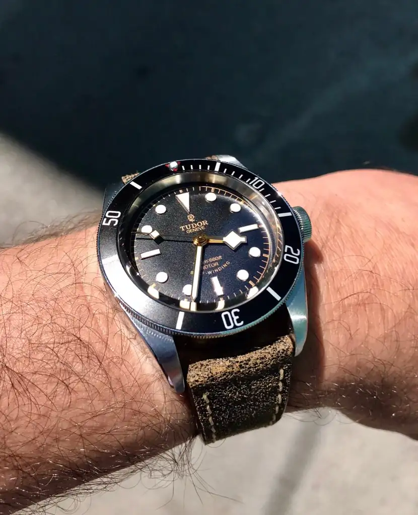 Este parece haber nacido para esa correa. Que bellezaA mí particularmente no me gusta la combinación, pero hay determinados modelos a los que le sienta francamente bien. Toda la línea black bay de Tudor es muy agradecida con cuero, al igual que los heritage diver de Longines (sea el skin o el legend).