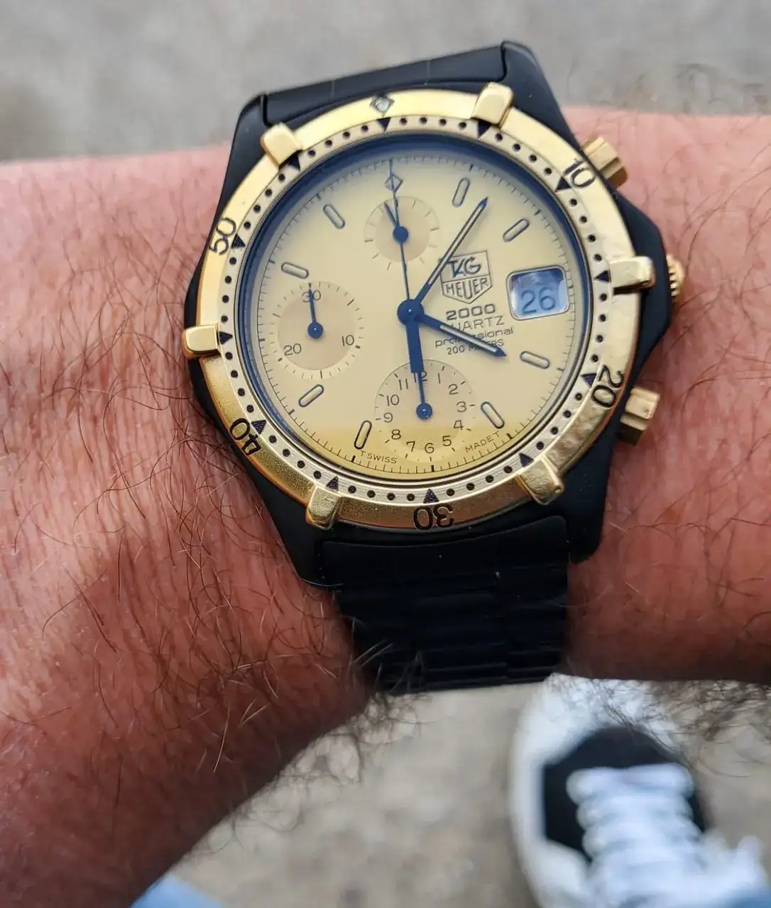 EMHO De lo mejor y más bonito que se ha hecho en cronógrafos de cuarzo en Heuer y Tag Heuer (y también fuera de la marca), preciosos esos cronógrafos serie 2000 con módulos Dubois Dépraz. En cuestión de cuarzos, todo lo que vino después, incluído lo actual de la marca, no tuvo ni una cuarta parte de la personalidad de la serie 2000. Un plus este tuyo en ese exclusivo acabado al más puro estilo JPS, de esos ya hay pocos con el tratamiento negro en buen estado. ¡A disfrutarlo!Hola este TAG profesional 2000 gold&Black pvd. lo encontré en una web japonesa de un stock antiguo. Es de 1986, un periodo de transición después de la compra de Heuer por parte de TAG en el 85, y tiene partes como la caja firmada solo por Heuer.