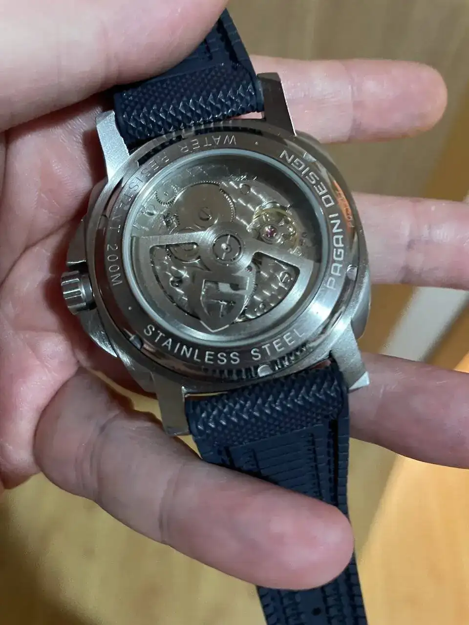 Ese calibre de Pagani me fascina. Mi padre tiene un Pagani Portuguese con el mismo.Yo tengo este, un homenaje con cierto estilo. La caja está sorprendentemente bien realizada y tiene detalles tan curiosos como la trasera vista con rotor esqueletado con el logo de la marca… deseando que llegue el verano para ponerlo más!