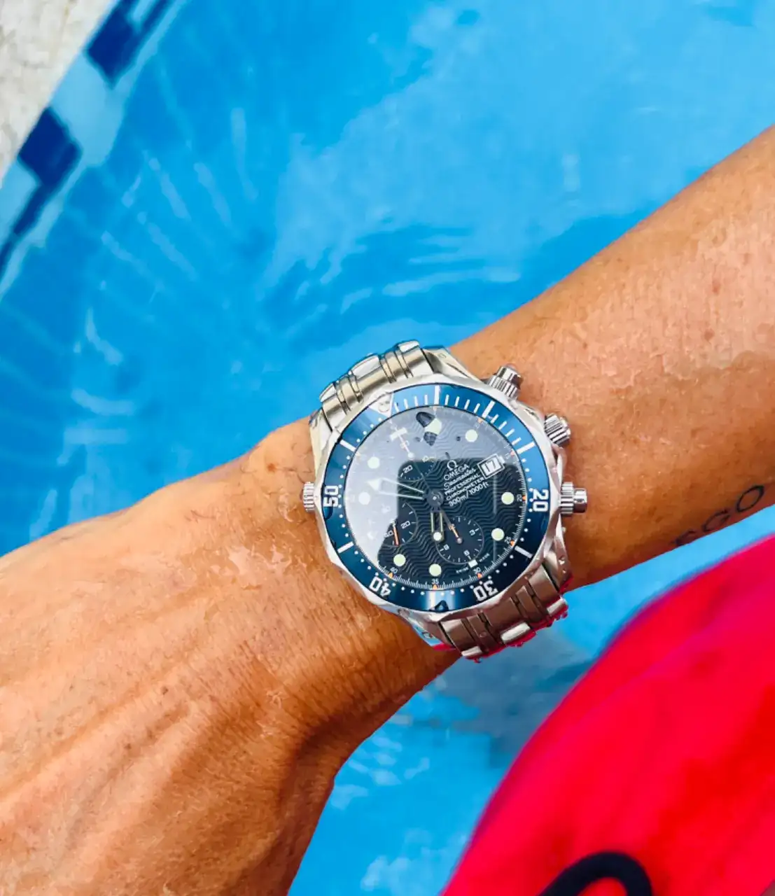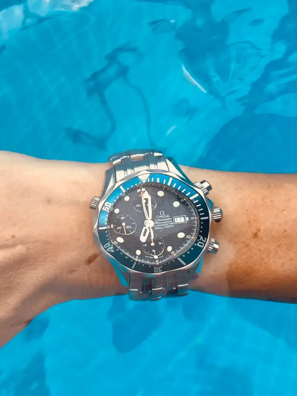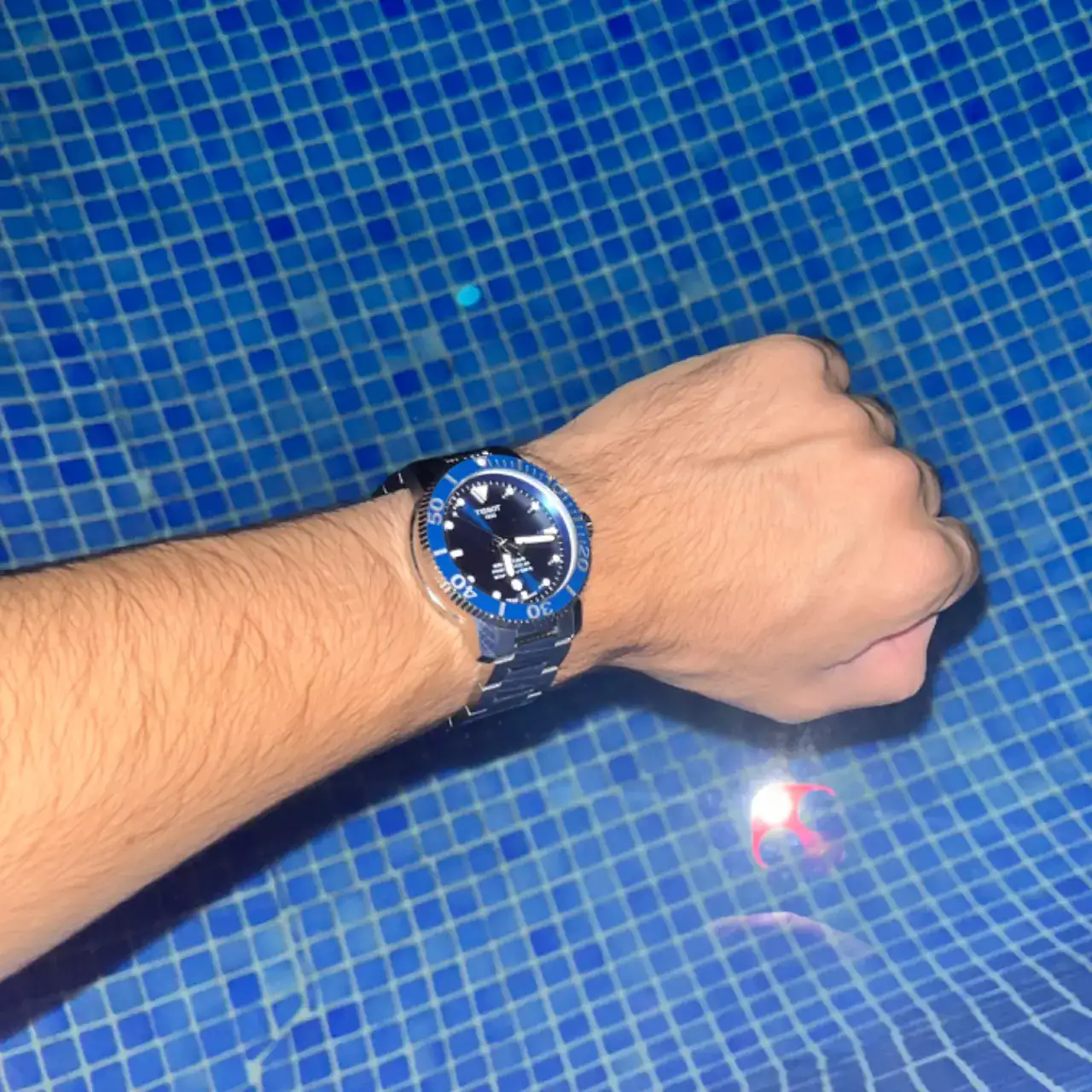 A algunos le dará un mareo con solo ver la foto. Yo, sin embargo, disfruto viendo cómo la gente disfruta de sus relojes.Hoy tocaba piscina y el que se ha mojado es este. No tiene la corona roscada pero si pone 100m en el fondo, se moja.
