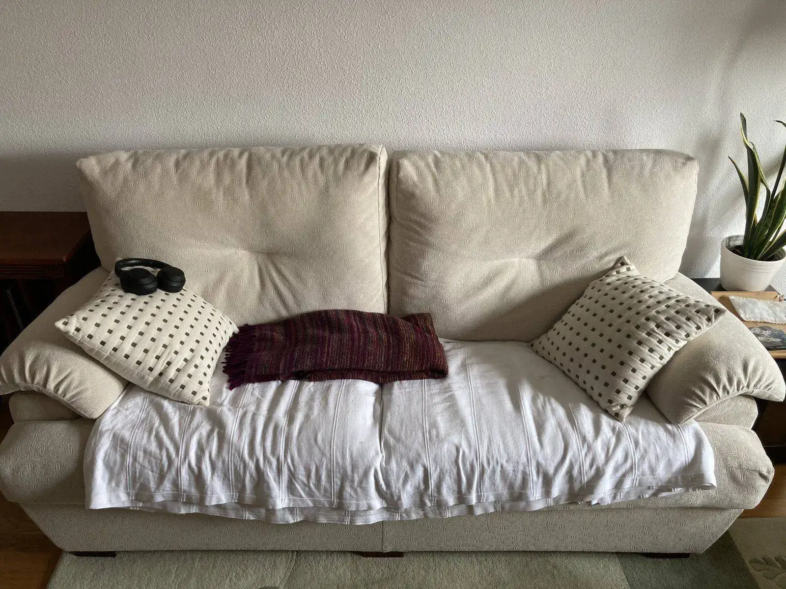 Y mi sofá, del que se acaba de quitar el gato al verme hacer la foto: