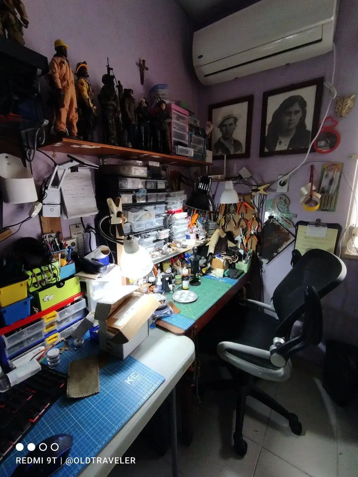 Saludos desde el puerto jarocho compañero.Saludos Old traveler, mira, que cantidad de figuras tienes. Parece, en la figura obscura que está por ahí, la"carrillera" de Chewbacca... Yo donde tengo mi mesa-taller-banco-laboratorio de pruebas y anexas, es mi habitación, tengo habilitado un laboratorio, para los experimentos con electro-galvanoplastia en otro rincón de casa, sin embargo, me siento más cómodo en mi habitación que, por decirlo menos, parece habitación de monje, el único adorno es mi mesa de trabajo.... Saludos desde Toluca, cómo tengo muchas ganas de ir a Veracruz, una vez más. Cuídate... Todos....