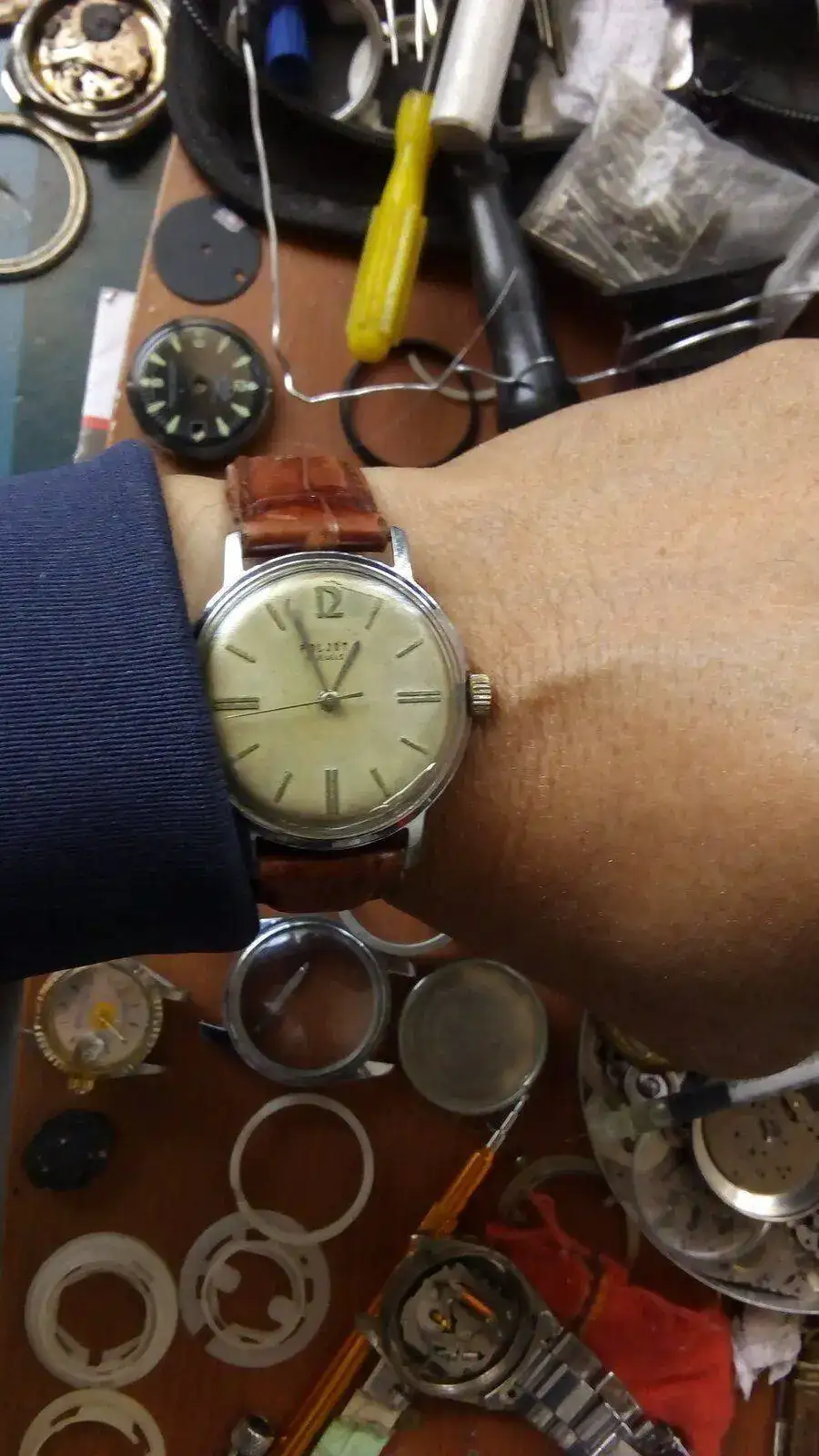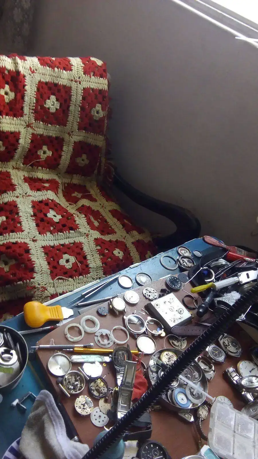 Jopeta, esa mesa está llena de piezas.👏👏Hola, buena tarde a este lado del Atlántico y buena noche al otro lado... Sofá, sofá no, más bien es un sillón donde, como se vé, después del trabajo, llegó a desestresarme con los relojes..... Jejeje
