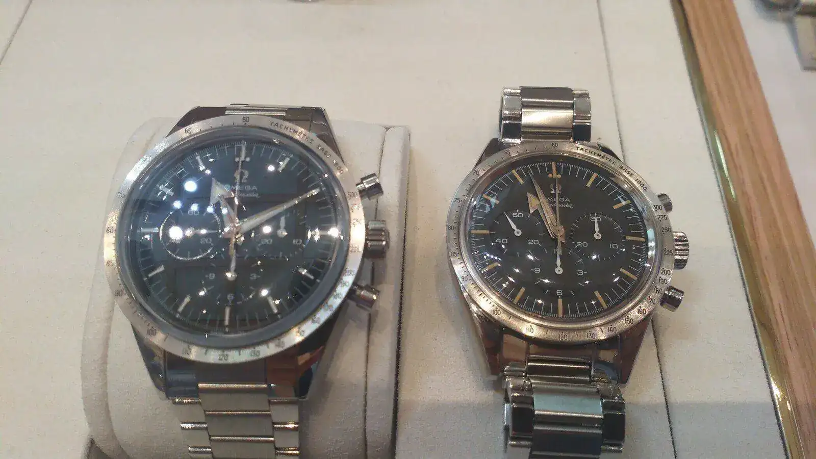 A continuación dos buenos ejemplares, a la izquierda el nuevo Calibre 321 Canopus Gold y a la derecha un ejemplar original CK 2915 de 1957 en un estado absolutamente excepcional que tienen en la sede de Omega. Tan parecidos y tan diferentes al mismo tiempo, 65 años de diferencia!