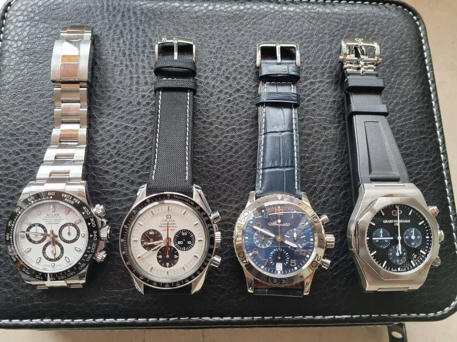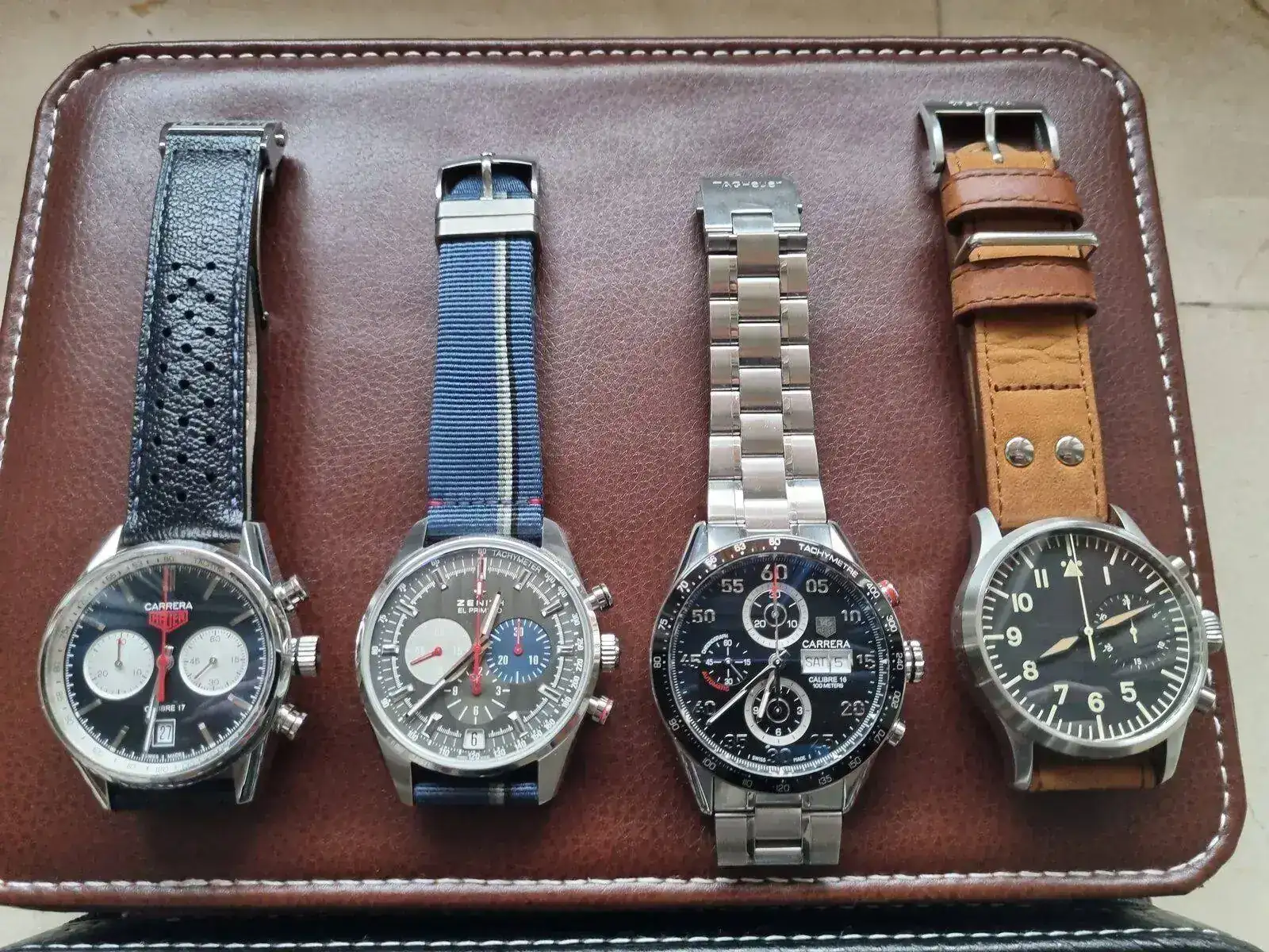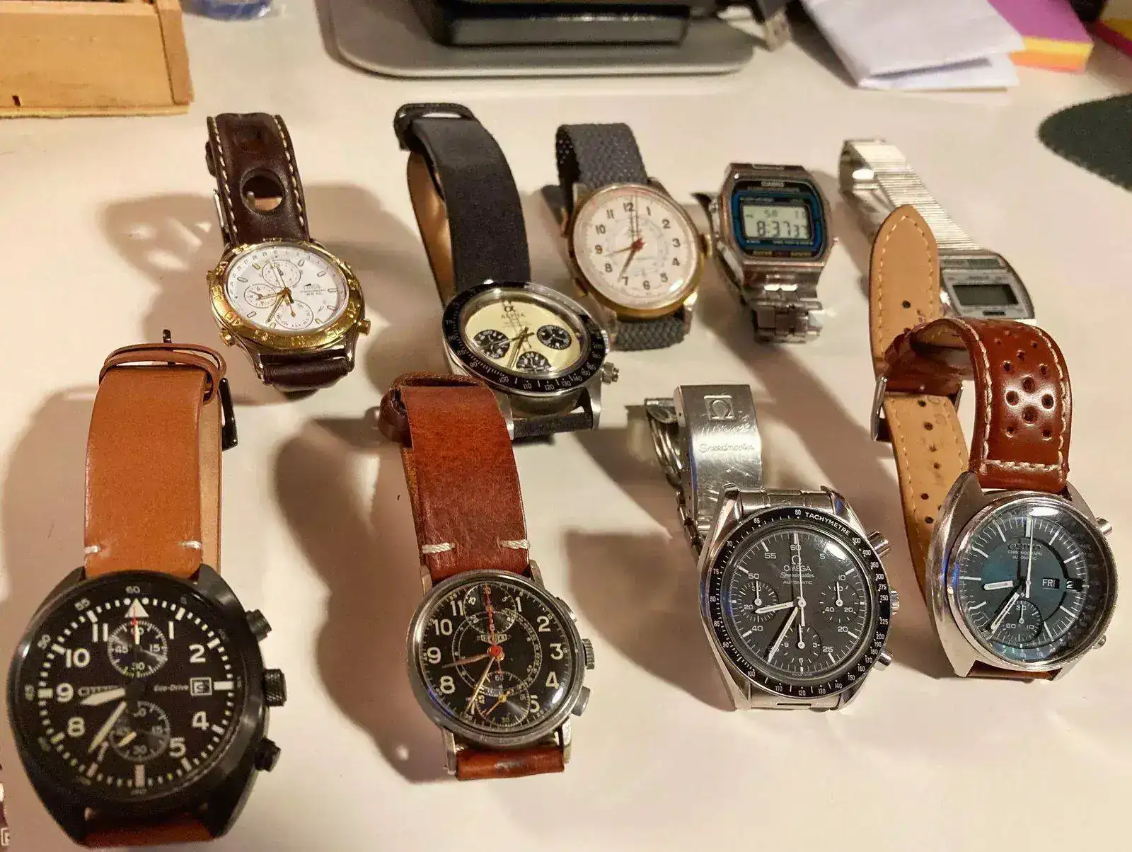 Organizando relojes hoy he puesto todos los cronos que tengo sobre la mesa, a falta de uno que me llegará por casualidad la semana que viene (ya os contaré), y estos son los que tengo.