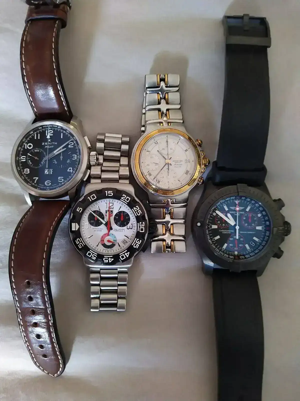 Los cronos fueron lo primero que llamó mi atención cuando empecé en esto. De hecho, mi primer reloj comprado por mí y porque quería precisamente ese fue un crono... que no está en esto que va a empezar, porque para mi vergüenza no están todos. Faltan los cuarzos, que no llegaron a tiempo para la sesión de fotos.
