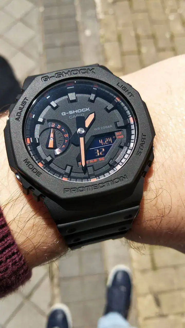 Tras más de un año sin incorporar nuevas piezas a mi humilde colección, este fin de semana he adquirido el Casio G-Shock GA-2100 en versión naranja. Tenía miedo a que fuera muy grande para mi muñeca y me planteé incluso pillar un GMA (versión para mujer). No obstante, las versiones GMA son demasiado femeninas en sus acabados y, tras probarme el GA, vi que queda relativamente bien en muñeca (no es un G-Shock de los más grandes). En un principio tonteé con la versión original (todo negro) y con la versión negra con indicadores blancos... pero al ver la versión en naranja me enamoré. Le da un toque bastante original, la visibilidad es mejor y da un poco más de color a mi pequeña colección.