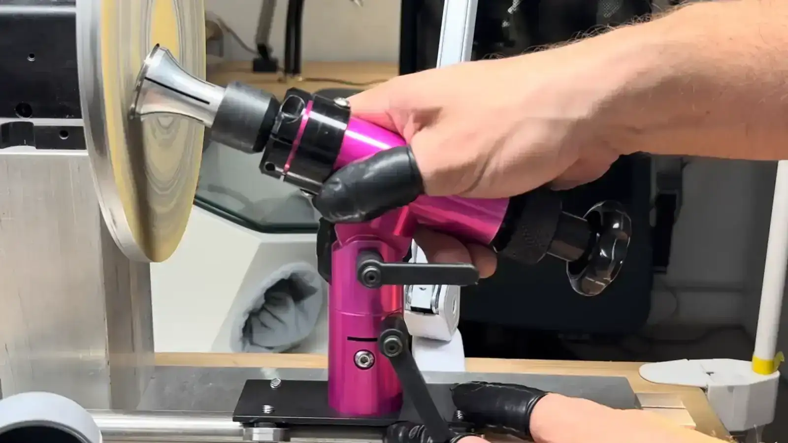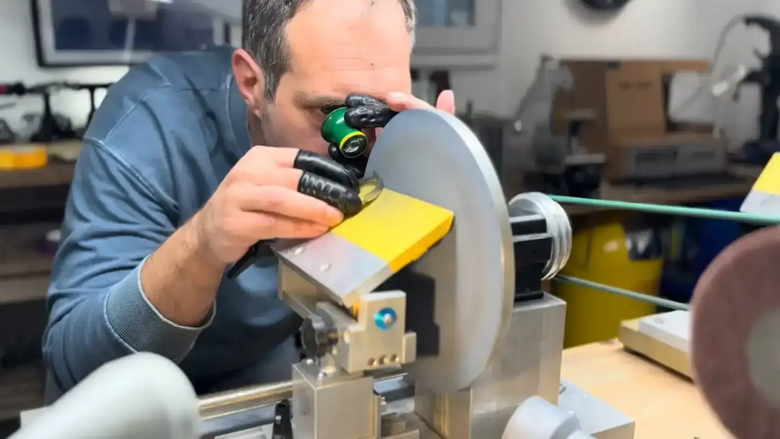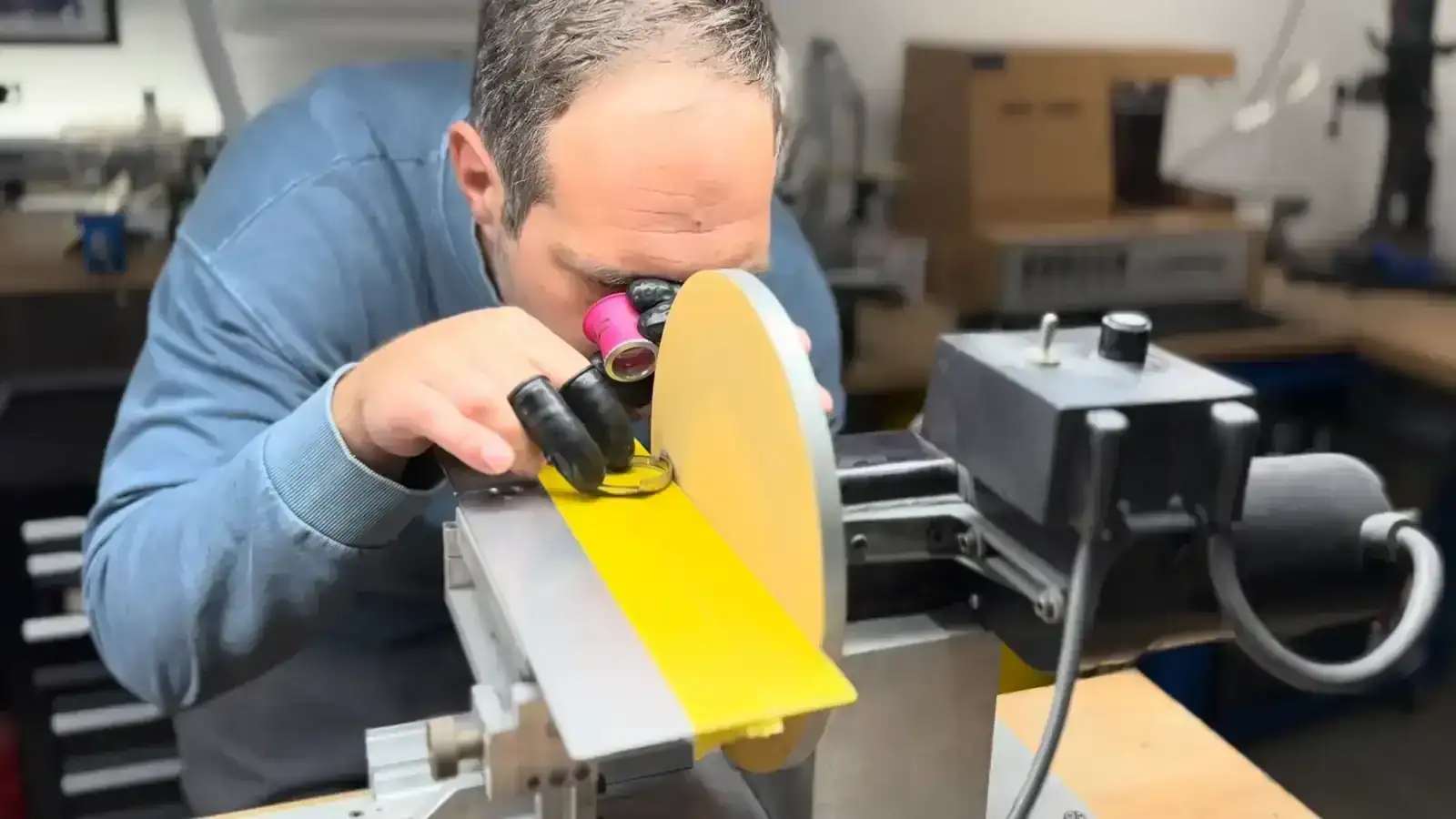 Proceso de achaflanado de una carrura (de un Speedmaster Mark IV) en la lapidadora: