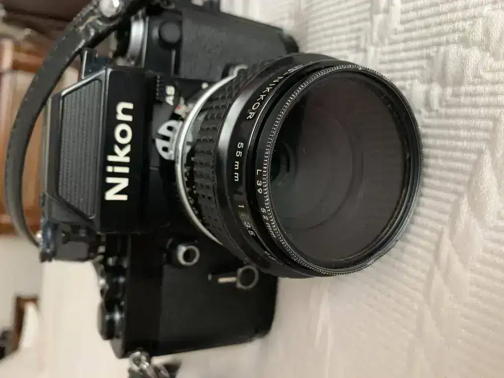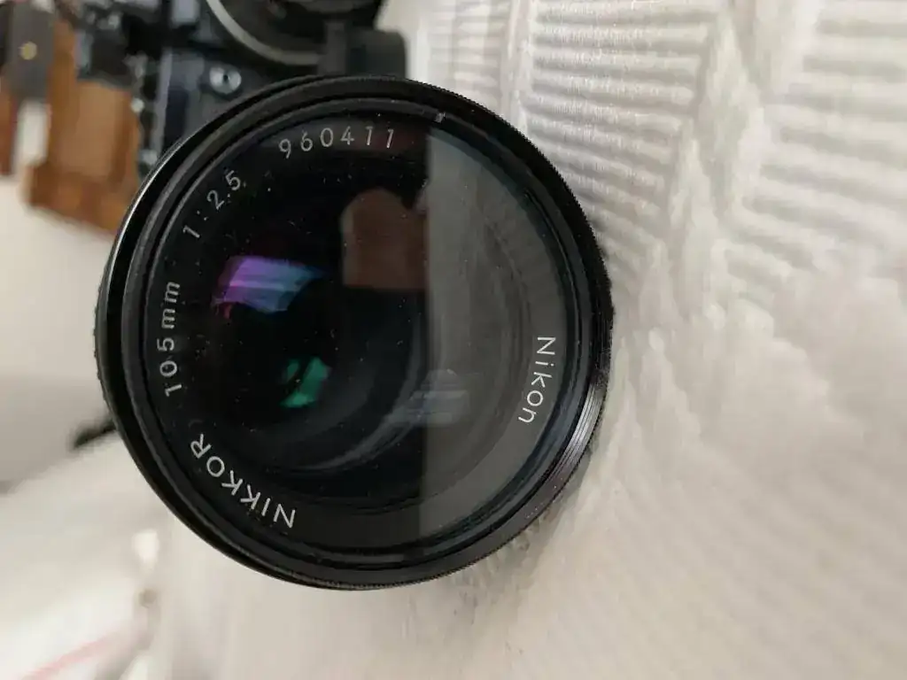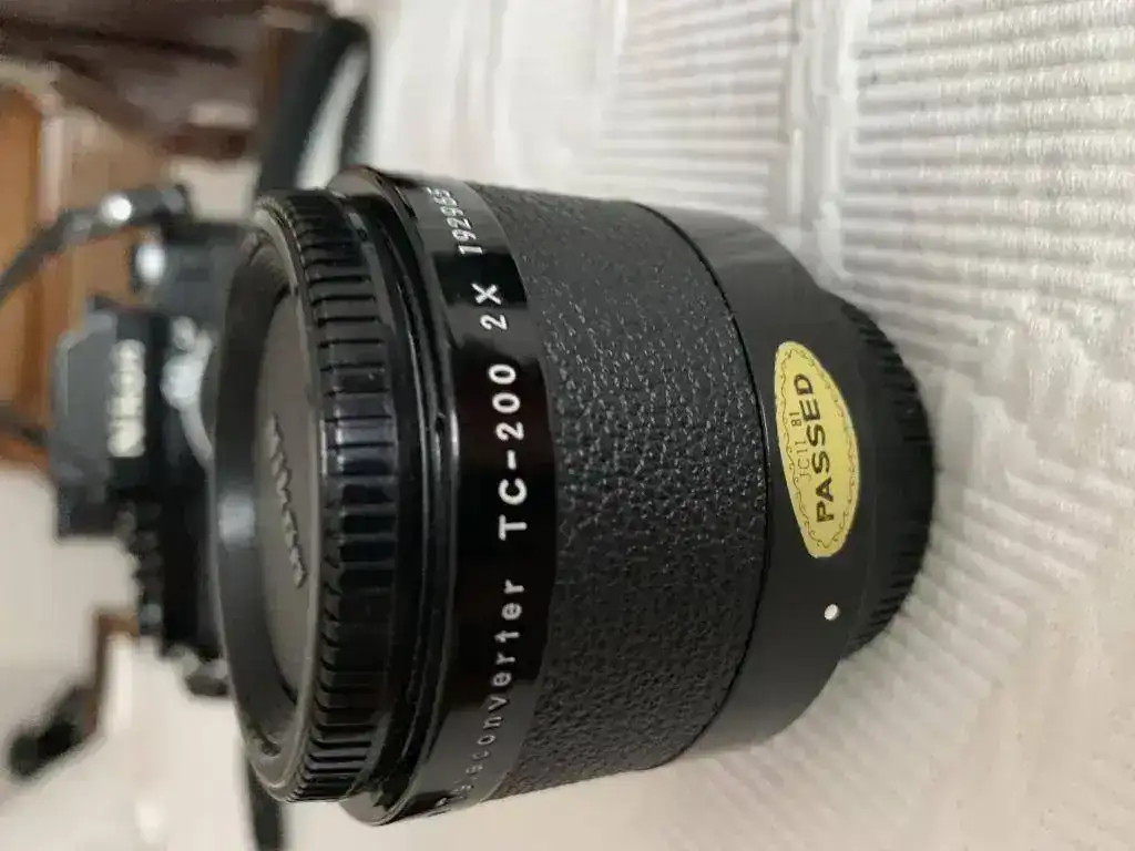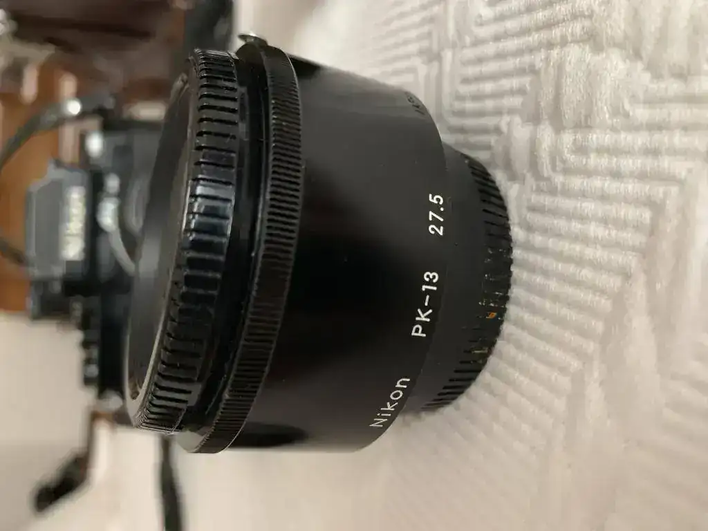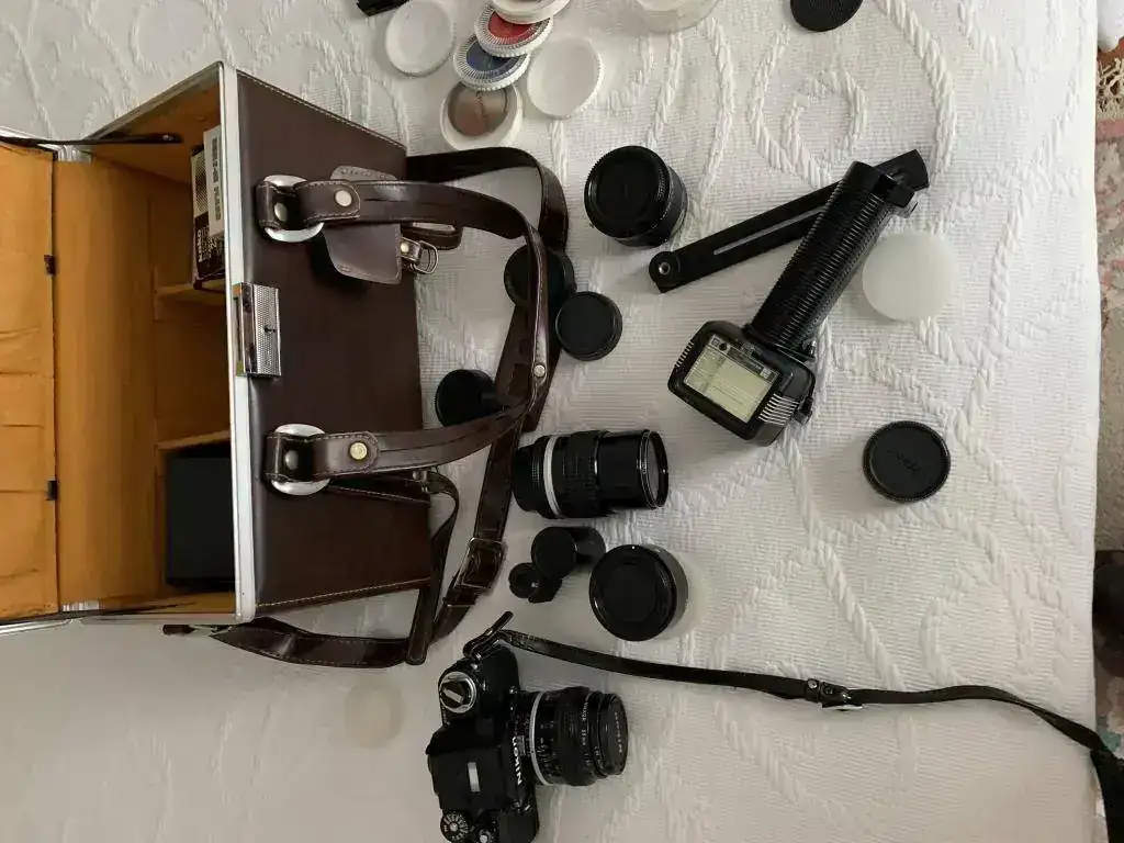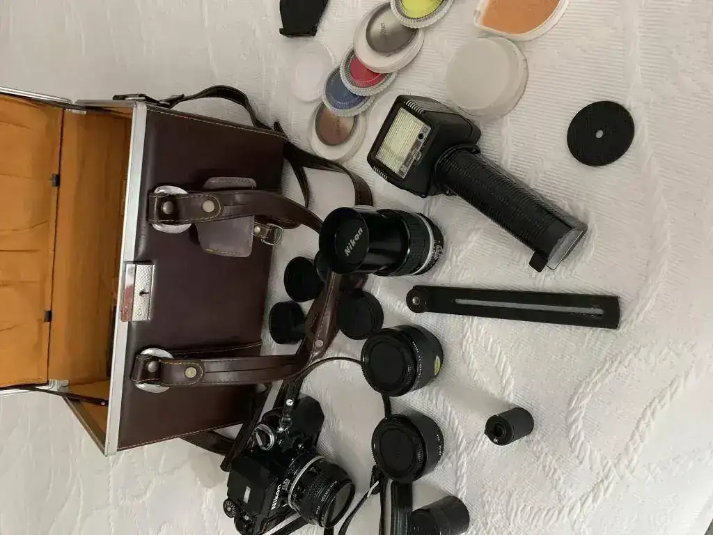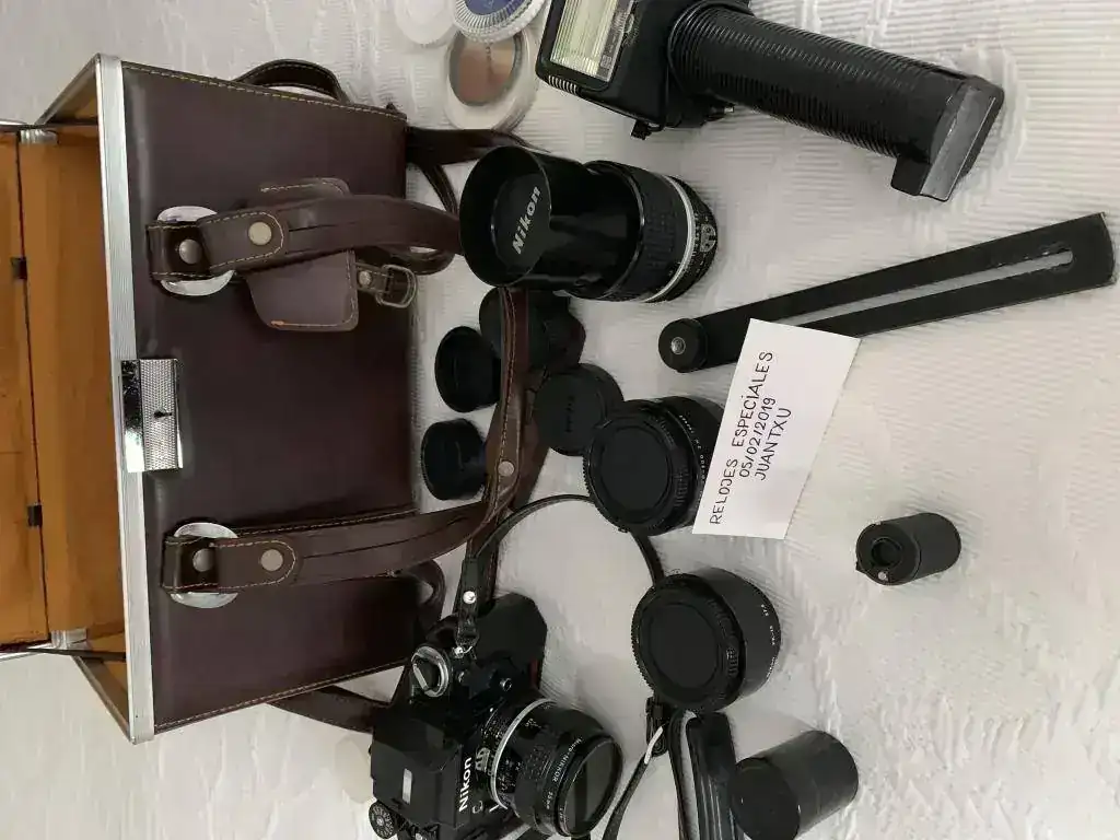 Cámara F2 Photomic AS negra, objetivo micro Nikkor 55 mm. 1:3,5 , objetivo Nikkor 105 mm. 1:2,5, adaptador Nikon PK-13 para objetivo macro 55 mm, duplicador Nikon telecoverter TC-200 para objetivo 105 mm., Un flas Metz y otro más pequeño, varios filtros, un carrete para rellenar película de 35 mm .y una bolsa de transporte para todo ello.