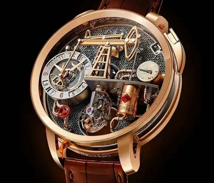Y de que puedes permitirte gastar tus petrodólares en su OIL PUMP, donde el mecanismo, Tourbillon incluido (es que eres un jeque, que menos, ¿no?) lleva un curioso sistema de ruedas que hace reflejar en la esfera una torre de extraccion de oro negro que reproduce el "bombeo" de estas...