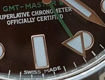 El canal parecía serio y el propietario pues también. La cuestión es que a medida que avanzaba la review, cuando hace zoom a su rolex para mostrar de cerca la cabeza de la aguja gmt, me llamó la atención la terminación que os pongo en la foto. Esa transición entre el rojo y el gris, al final de la aguja, donde empieza la cabeza en forma de flecha.