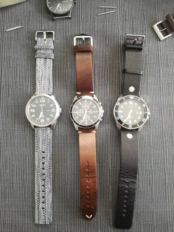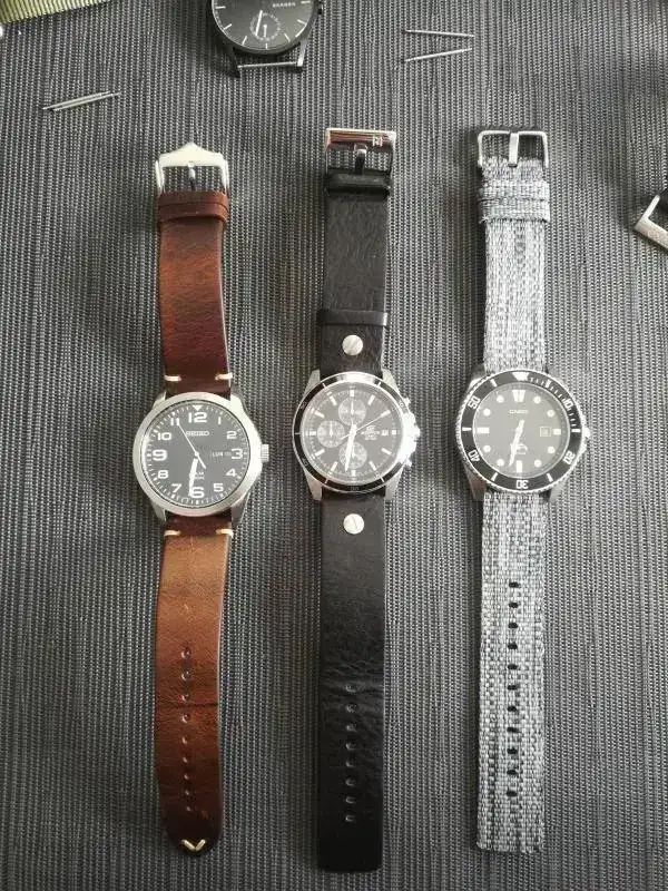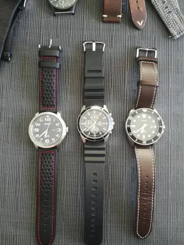 Me gustan todas las combinaciones, unas mas que otras, pero eso es cuestión de gustos, la correa que menos me gusta con diferencia es la negra de la primera foto con la tachuela en el medio, la militar verde y la de piel de la primera foto me encantan, y tranquilo, todos estamos igual...........en algo hay que matar el tiempo.