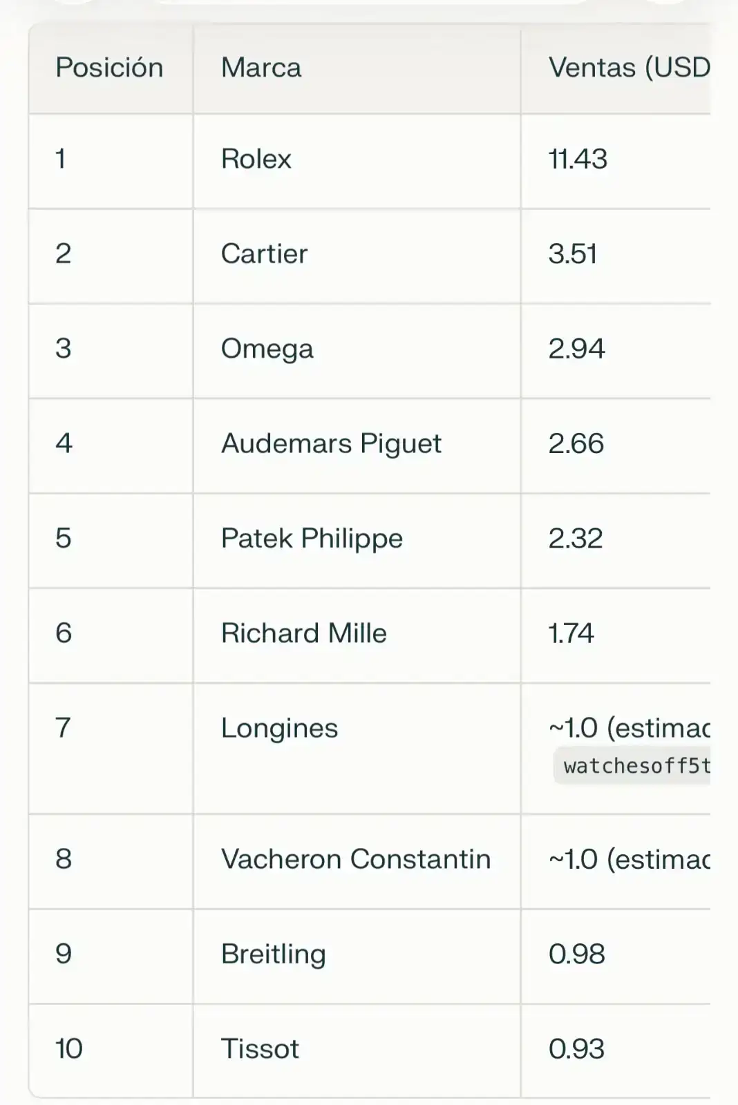 En ventas de relojes de marcas Suizas, por número de unidades, el ranking es el siguiente. (En 2024 según Morgan Stanley)