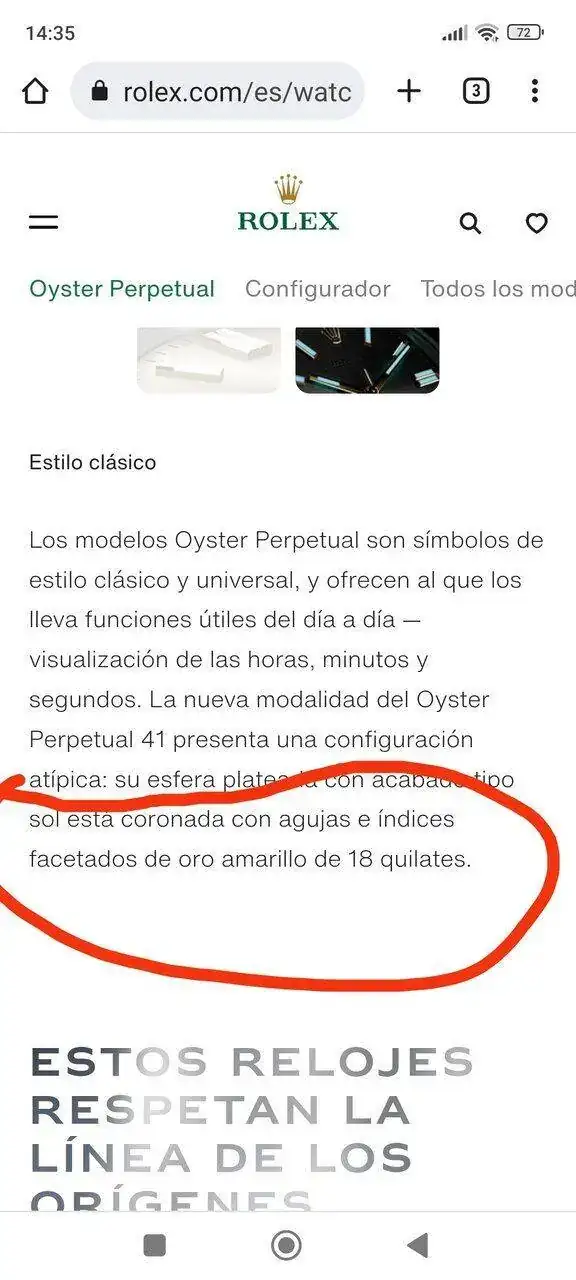 Es lo primero que fui a ver para contestar al compañero, pero no lo vi por ningun sitio especificado. Te juro que me rebusque por todos los subapartados (como los hacen, esferas, diales, etc...) de la web, y no vi ninguna referencia a las agujas de oro. Hasta use su buscador y nada... Y mira q juraria q lo indicaban donde has dicho, pero ni rastro.