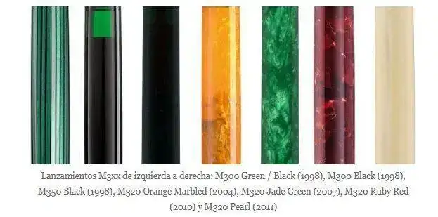 Por el camino se unieron versiones en negro integral con visor de tinta en verde; versión negra con capucha de plata chapada en oro (M350) y variantes en colores (M320) de las cuales la más conocida puede ser la Vibrant Orange (naranja intenso) que tuvo su paralela en la M620 Vibrant Orange. Todas han llevado plumines de oro bicolor (de 14 o 18 kt) y acabados de los componentes metálicos y adornos en dorado, no existiendo versiones en rodio (que hubieran sido las M3x5).