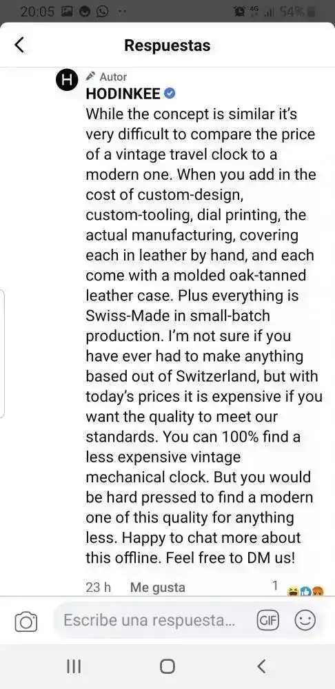 Pero en otra de las críticas...argumentan el precio debido a los costes actuales de fabricar en Suiza, al "moderno" mecanismo (perdona?), y a los niveles que Hodinkee solicita para una pieza de primer nivel (perdona otra vez?¡!)