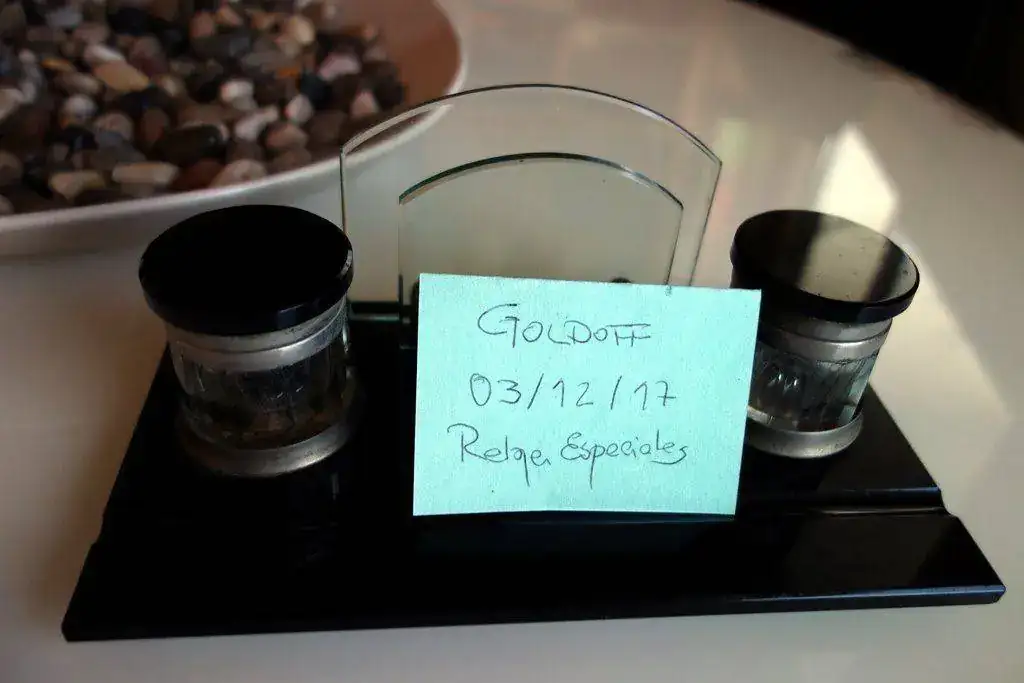 ofrezco a quien pudiera interesar esta escribanía en un estad muy bueno. El únioc pero es que la bisagra de una de las tapas se rompió y lo que hace su función es un pequeño alambre, algo que no se notará si no vas a usar los tinteros para llenarlos de tinta. Por cierto, el tintero con la bisagra rota está fijado a su base y no puede salir. Igualmente, no va a notarse en una utilización decorativa, que es la que le he dado yo. Los dos cristales sujeta cartas son originales y biselados. Por 65 € te lo pongo en caso por mensajería sin asegurar.