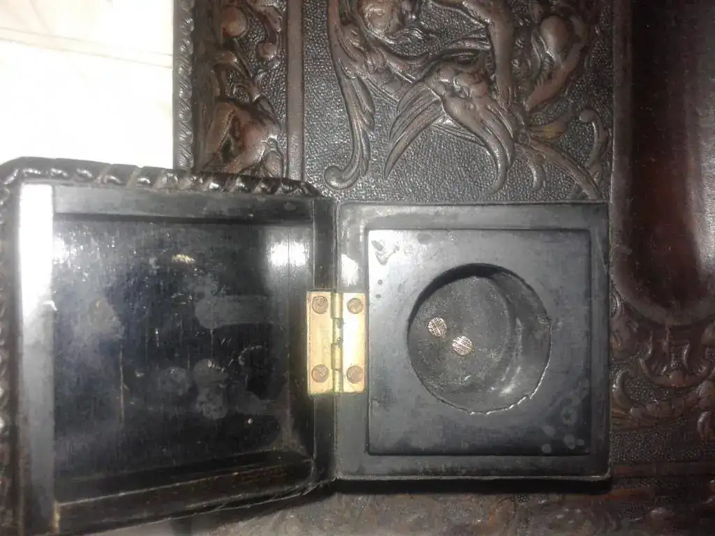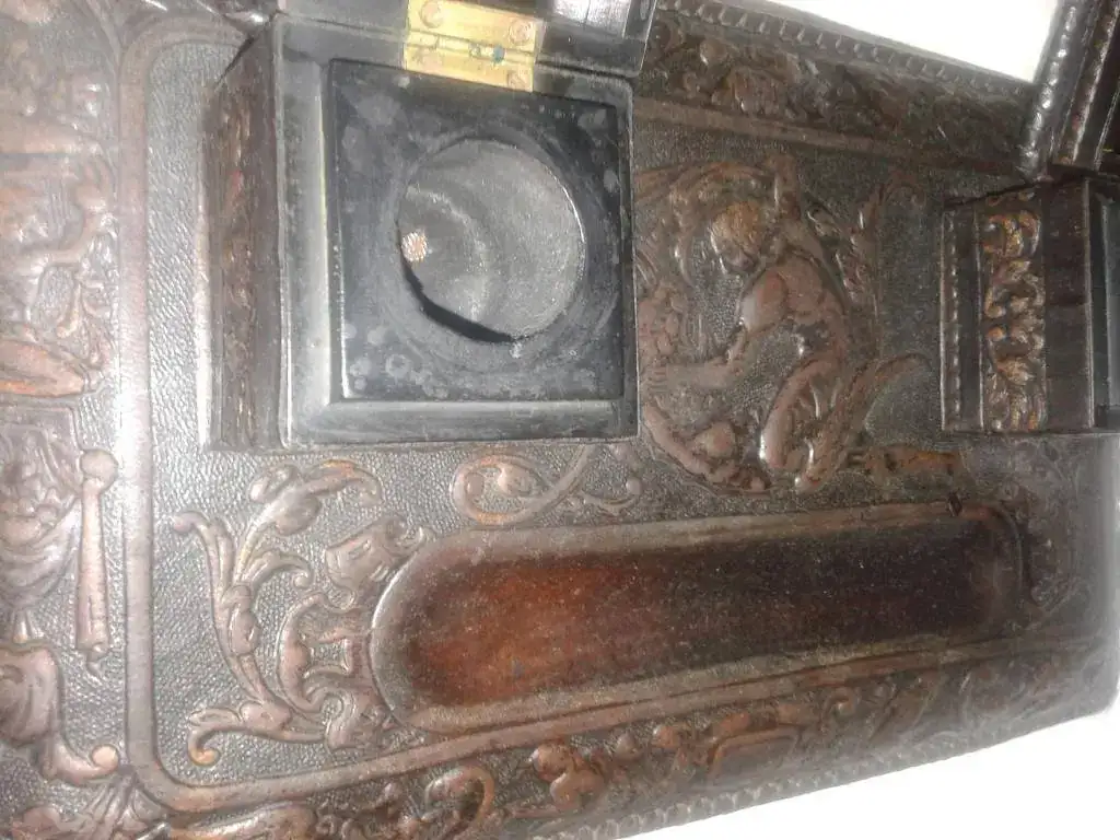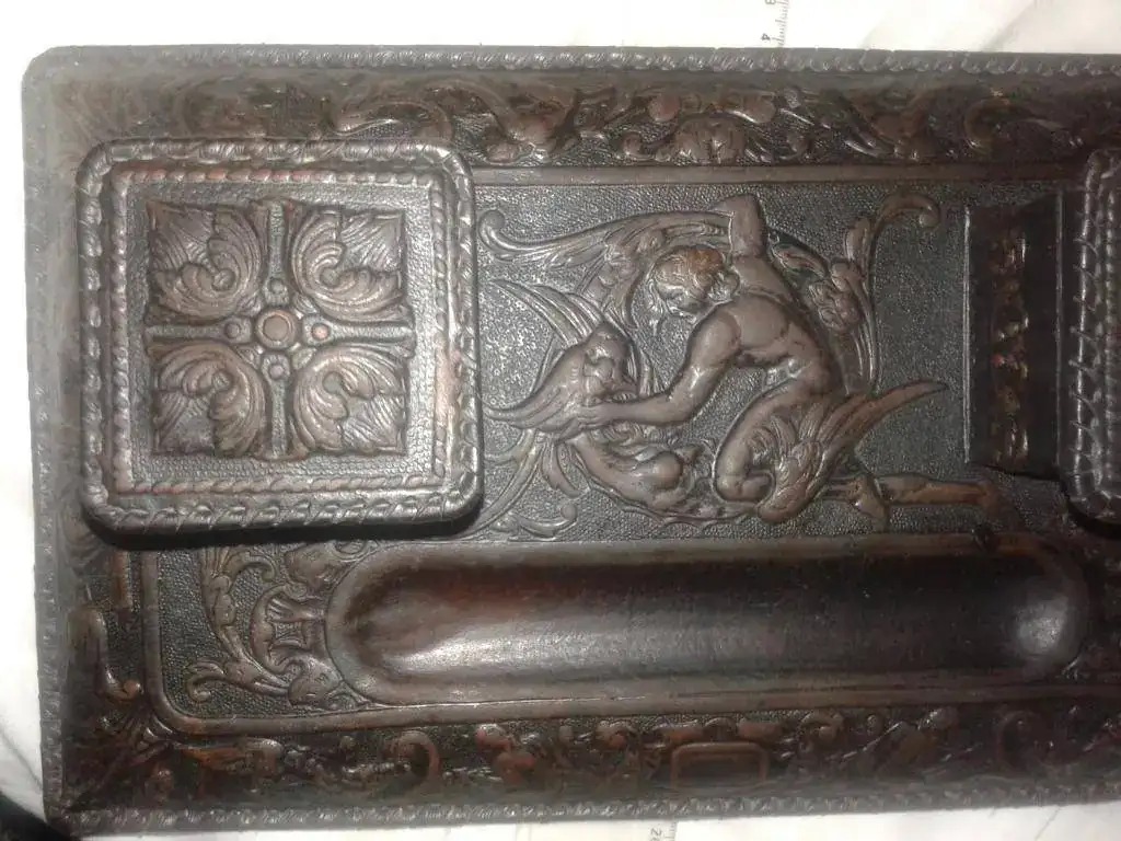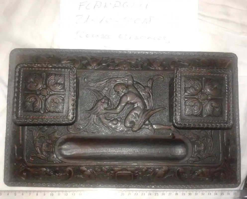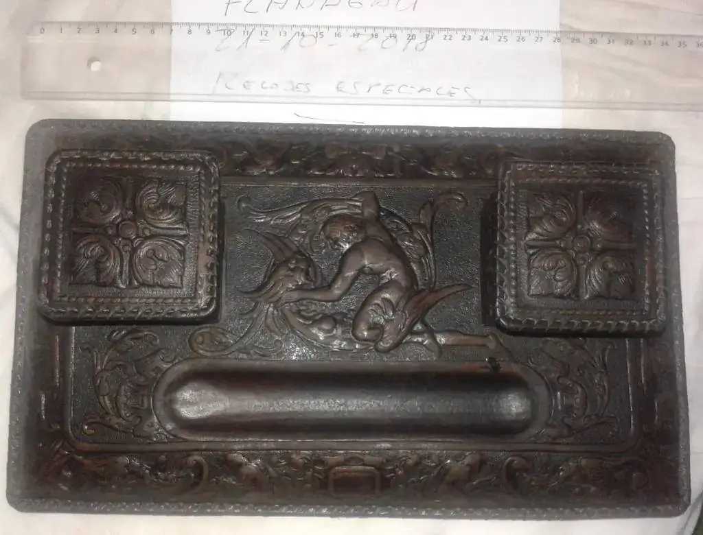 Hola a todos, vendo esta escribanía de los años 20/30 del pasado siglo, en unas condiciones muy buenas, solo tengo el cuerpo principal, en cuero repujado, la alegoria es un angel matando a un demonio, la eterna lucha del bien contra el mal, aunque yo creo que siempre vence el mal, una broma...... las medidas 35 cms x 20 x 7 aproximandamente, el precio con envio por paquete de correos 95 euros, mensajes por privi o al 6--0--6&026-889, gracias a todos por leer y a RE por el espacio.