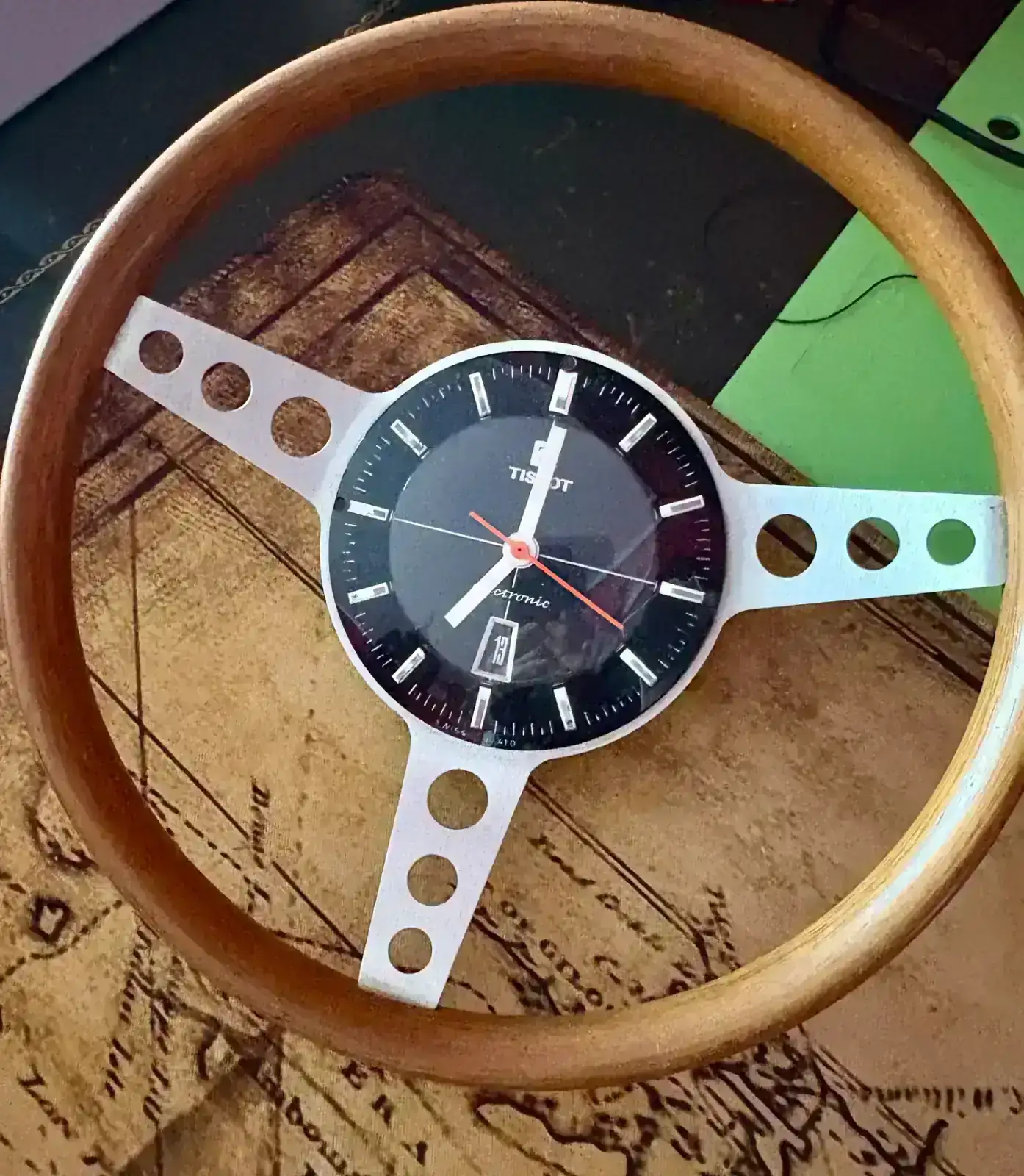 Este de sobremesa no lo sé, pero el de pared (igual pero más grande) va montado sobre un genuino volante Nardi 🥰 No lo tengo a mano ahora y no localizo foto, pero os dejo una de la Web