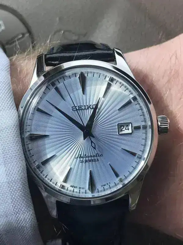 yo tengo este Seiko SARB065 (el "Cocktail"), y el precioso dial azul celeste puede verse desde plateado hasta violáceo dependiendo de la luz.