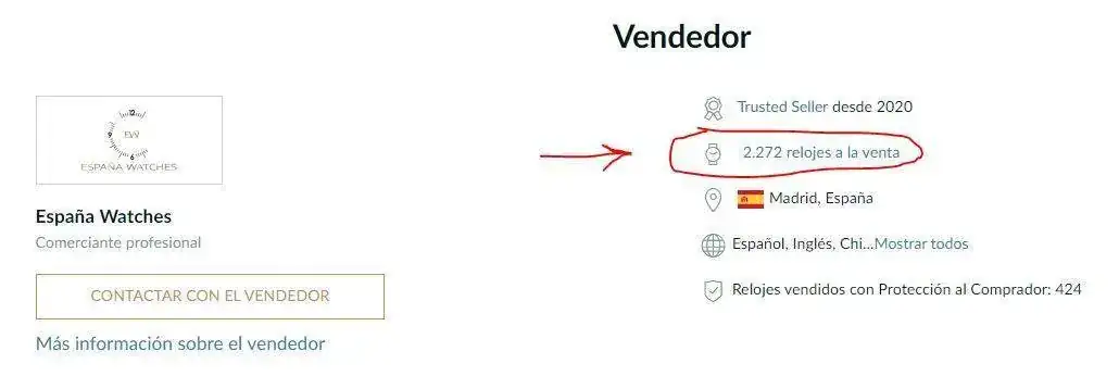 Buceando en Chrono24, me he topado con el Trusted Seller España Watches, el cual presenta en stock 2.272 relojes. De los cuales 422 son Rolex y 113 Patek Phillipe entre muchos otros.