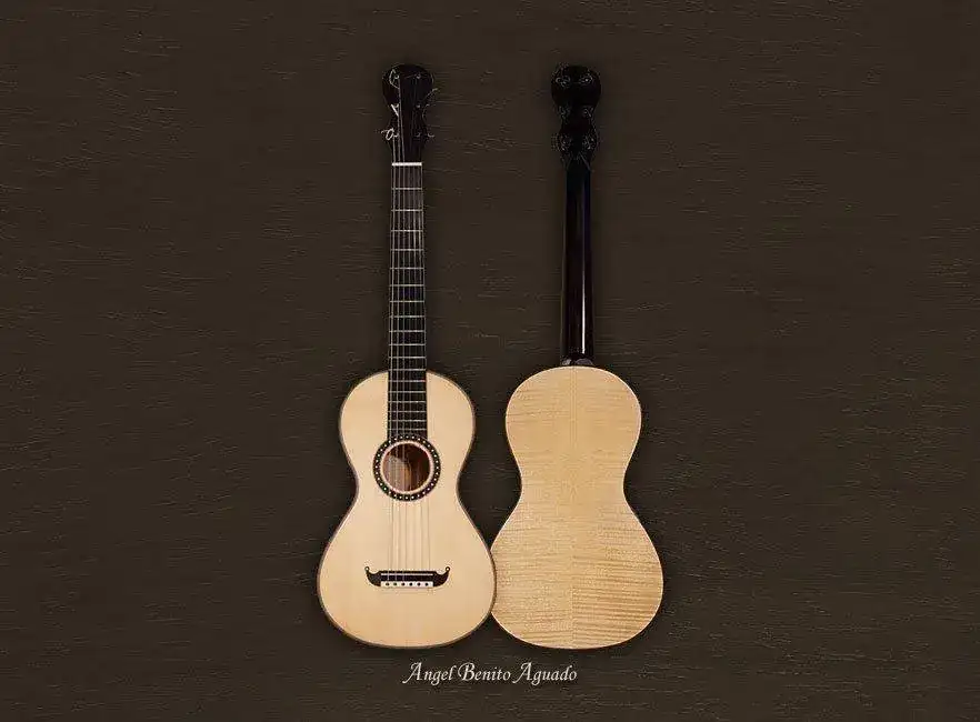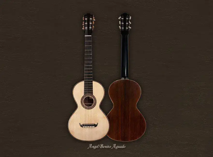 Para el que no sepa que es una guitarra romántica (pongo dos reproducciones del que podría ser el mejor guitarrero y la suya, la mejor guitarrería, de Madrid, Ángel Benito Aguado: