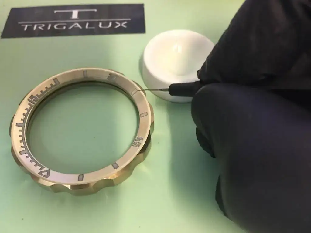 - Bisel: listo y acabado geometría al 100%. Se mejorará el acabado final. También veréis unas rallas muy finas en la superficie del bisel, es un tema del láser con el que se ha hecho el grabado. Para el definitivo se ajustará el programa y se mejorará la definición. El pintado de los índices nos lo ha hecho Angelo de Trigalux (antes Luxmento) ... un verdadero artesano. El resultado es espectacular.