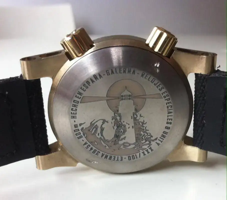 - Fondo: hemos hecho muestras a láser de los dos fondos en titanio. En las fotos veréis que están un poco "sucias", sobre todo la calavera. Como con el bisel es un tema del láser, el proveedor ha de ajustar el programa para que quede todo uniforme, pero ya podéis ver el aspecto final. El fondo está sin acabar (tal cual sale de la máquina) y faltan las muescas.