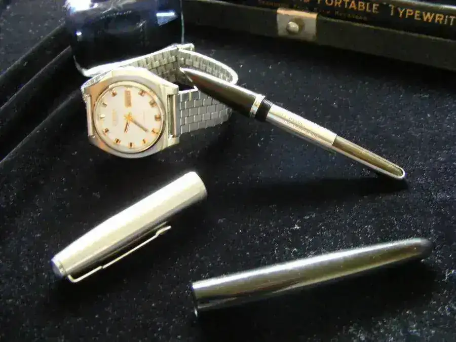 En las fotos aparecen mis 3 pasiones, las estilográficas, las maquinas de escribir(una Underwood Portable de los años 20) y los relojes(un Citizen 21 Jewels GN 4W S de los 80 heredado de mi abuelo)