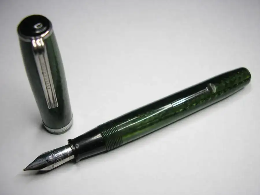 En venta esta Esterbrook fabricada en USA en 1949-52 en celuloide color verde perlado monta un plumín de acero marcado 9668 firme de punto medio, la estilográfica carga por palanca y se encuentra lista para funcionar.